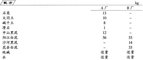 按配比分别将A厂或B厂所用的全部物料混合,粗磨,再加水和纯碱细磨,过筛、除铁,得到2种坯浆。