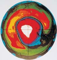 释义 | 南极臭氧空洞 1985年起观测到的南极地区特有的一种臭氧空洞现象。 表现为南极地区每年春天(8—10月)来临时平流层臭氧浓度的大幅度减少。其主要原因是人类活动排放的氯氟烃的影响。南极臭氧空洞被引作平流层臭氧耗竭的重要论据之一。 南极臭氧空洞卫星摄影图 |