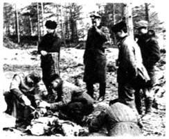 释义 | 卡廷事件 1940年春波兰战俘被集体枪杀的事件。 1939年9月,苏联乘德国入侵波兰之机,出兵占领*寇松线以东波兰领土,并俘虏大批波兰军人。1940年4月,在斯摩棱斯克附近卡廷(Kaтен)森林4 421名波兰军人被处决。后该地区被德军占领。1943年4月,德国占领当局宣布在卡廷森林内发现被杀波兰军人尸坑。 苏联政府旋声称此事与己无关,而系德军所为。第二次世界大战后,此事件成为悬案。 1990年4月,苏联正式承认事件制造者为当时的苏联内务部门。 卡廷森林中的现场勘查 |