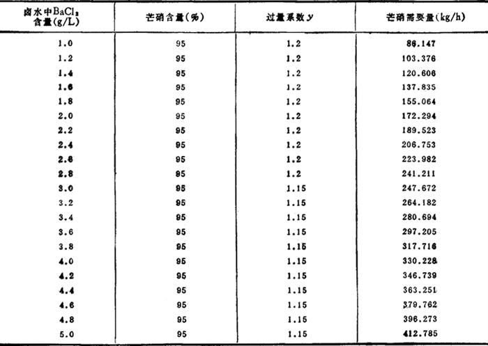 按上式计算,卤水中BaCl2含量为1~5g/L时,芒硝需要量如表3-4-21。