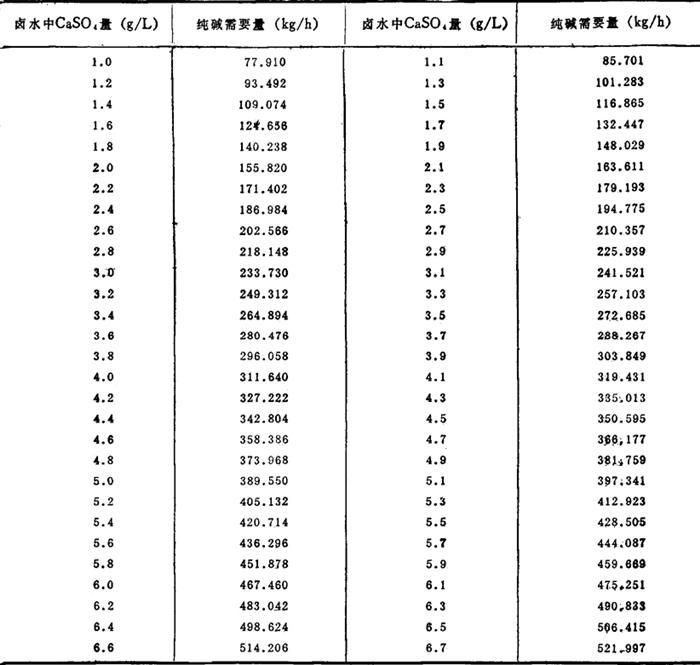 若CaSO4含量为5g/L,过碱量0.05%,纯碱含量98.0%,处理量100m3/h。
