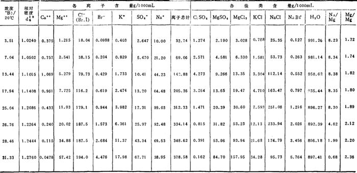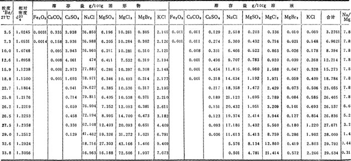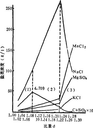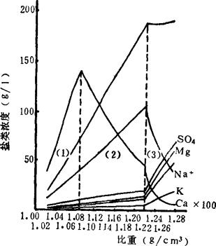 释义 | 卤水的理论组成 以海水为原料,逐步蒸发浓缩到终止浓度,中间不掺兑已析盐的卤水,可制得的各级卤水组成,见表2-1-8、2-1-9。 表2-1-8 石桥、村上的试验(日本海海水) 注:上表试验,蒸发温度40℃,测定浓度温度27℃。 表2-1-9 天津轻工业学院盐化工程系孙之南、郭绍珍的试验(渤海湾海水) 为了找出在浓缩过程中,各种成分与浓度的关系,将表2-1-9数据,标绘于图2-1-1和2-1-2。由图2-1-1可见,Ca++和Na+浓度曲线有明显高峰,由峰点作相对密度轴垂线,两垂线可将图面分为三个区域。在(1)区,所有各离子浓度曲线,均保持上升趋势,只是由于初始浓度不同,上升的趋势不等。在(2)区,除Ca艹浓度曲线呈现下降趋势外,其他离子浓度曲线仍保持上升趋势,其中,除SO4=浓度曲线上升趋势,较在(1)区时减小外,其他均有所增大。在(3)区,Na+、Ca艹浓度曲线下降,开始阶段下降趋势较(2)区为陡,最后减缓;Cl-浓度在初始时稍有下降后,随即保持平稳,最后又呈上升趋势;其他离子浓度曲线较(2)区更陡地呈现上升趋势。 图2-1-1 渤海水浓缩过程中组成变化 图2-1-2 海水浓缩过程中盐类浓度与比重关系曲线 图2-1-2盐类曲线同样又分三个区,其中硫酸钙浓度曲线在(1)区呈上升趋势,(2)区呈下降趋势;氯化钠浓度曲线由(2)区转入(3)区时,发生同样变化。从而表明:由(1)区到(2)区,即 卤水饱和点和结晶析出点与卤水组成的关系,在水盐体系内,饱和点是指溶解和结晶过程的平衡点,对该盐类来说在卤水中的成分是不变的,其饱和点可以确定。而析出点是指该盐类在卤水中饱和后,继续蒸发,具有一定过饱和推动力后开始结晶的那个点。这个点的该盐成分高于饱和点。按相平衡而论,析出点是相变点,饱和点是平衡点,相数不发生变化。 |