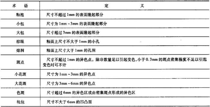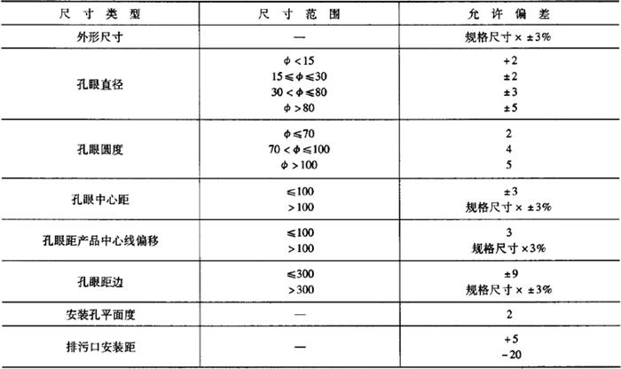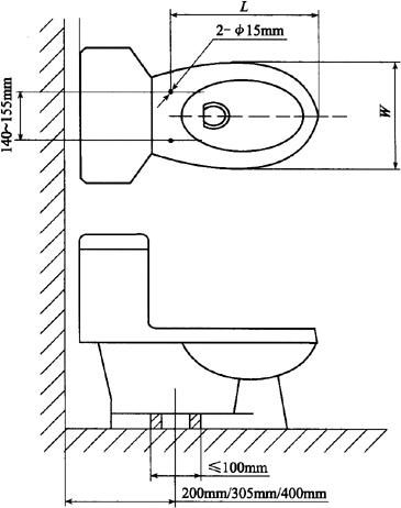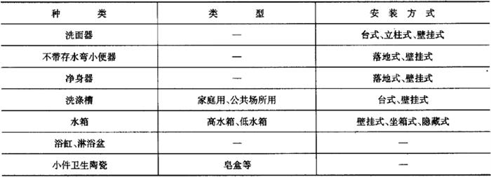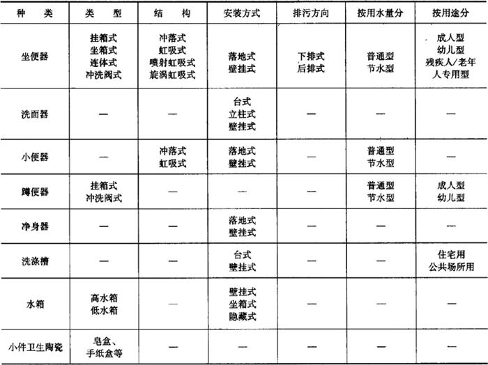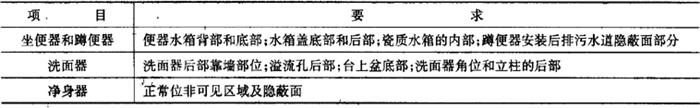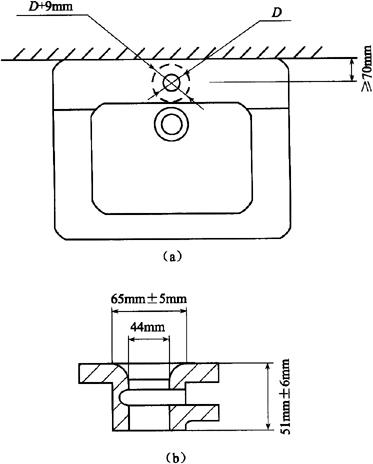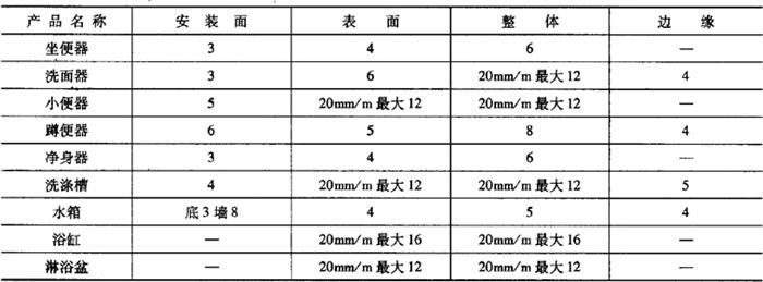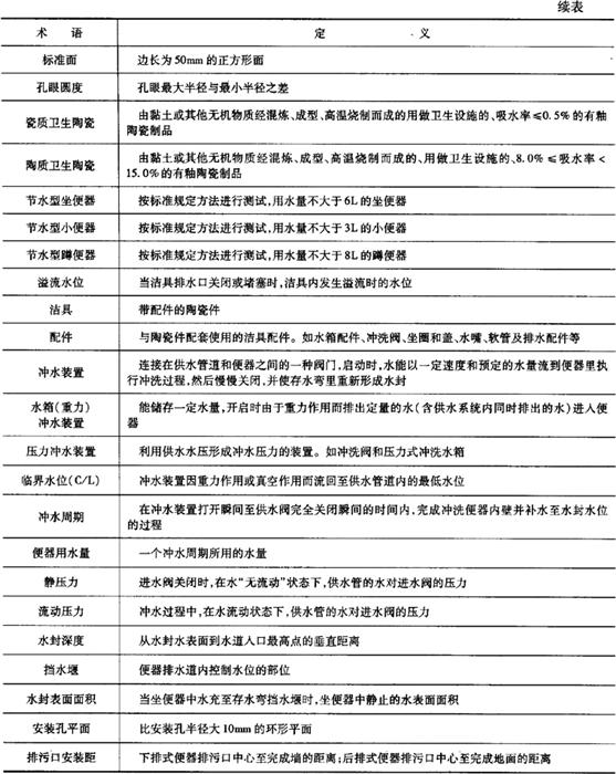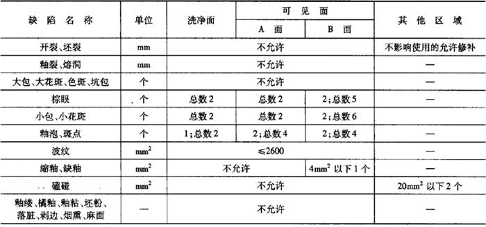 释义 | 卫生陶瓷 1.术语(表6-68) 表6-68 卫生陶瓷的相关术语 2.产品分类 按吸水率分为瓷质卫生陶瓷和陶质卫生陶瓷。 (1)瓷质卫生陶瓷 瓷质卫生陶瓷产品分类见表6-69。 表6-69 瓷质卫生陶瓷产品分类(2)陶质卫生陶瓷 陶质卫生陶瓷产品分类见表6-70。 表6-70 陶质卫生陶瓷产品分类3.外观质量 (1)釉面 除安装面及下列所述外,所有裸露表面和坐便器的排污管道内壁都应有釉层覆盖;釉面应与陶瓷坯体完全结合。釉面外观质量要求见表6-71。 表6-71 卫生陶瓷釉面外观质量注:其他在窑炉内支撑烧成时非可见面区域也可以无釉覆盖。 (2)外观缺陷最大允许范围 对产品的洗净面、可见面、其他区域(安装面和隐蔽面)进行划分。外观缺陷最大允许范围应符合表6-72的规定。 表6-72 卫生陶瓷外观缺陷最大允许范围注:1.数字前无文字或符号时,表示一个标准面允许的缺陷数。 2.其他面,除表中注明外,允许有不影响使用的缺陷。 3.0.5mm以下的不密集棕眼可不计。 4.最大允许变形(表6-73) 表6-73 卫生陶瓷产品的最大允许变形量mm注:形状为圆形或艺术造型的产品,边缘变形不作要求。 5.尺寸 (1)尺寸允许偏差(表6-74) 表6-74 卫生陶瓷的尺寸允许偏差mm(2)重要尺寸 卫生陶瓷产品应符合以下所规定的尺寸要求。其允许偏差没有注明的应符合表6-74的规定。 1)坐便器排污口安装距见表6-75。 表6-75 坐便器排污口安装距注:特殊情况可按合同要求。 2)坐便器和蹲便器排污口最大外径见表6-76。 表6-76 坐便器和蹲便器排污口最大外径3)水封深度。所有带整体存水弯卫生陶瓷的水封深度不得小于50mm。 4)坐便器水封表面面积。安装在水平面的坐便器水封表面面积不得小于100mm×85mm。 5)冲洗阀式坐便器和小便器进水口距墙。用冲洗阀的坐便器进水口中心至完成墙的距离、用冲洗阀的小便器进水口中心至完成墙的距离应不小于60mm。 6)大便器和小便器水道最小过球直径见表6-77。 表6-77 大便器和小便器水道最小过球直径7)洗面器和净身器的供水孔尺寸。洗面器和净身器供水孔表面安装平面直径应不小于(供水孔直径+9)mm。 8)水箱进水孔和排水孔尺寸。低水箱进水孔直径为25mm或29mm,排水孔直径为65mm或81mm。特殊情况可按合同要求。 9)淋浴盆和浴缸排水口尺寸。淋浴盆、浴缸排水口直径为60mm;特殊情况可按合同要求。 10)壁挂式坐便器安装螺栓孔尺寸。壁挂式坐便器的所有安装螺栓孔直径应为20mm~26mm,或为加长型螺栓孔。 11)坯体厚度。卫生陶瓷任何部位的坯体厚度应不小于6mm。 (3)吸水率 1)瓷质卫生陶瓷产品的吸水率E≤0.5%; 2)陶质卫生陶瓷产品的吸水率8.0%≤E<15.0%。 (4)抗裂性 经抗裂试验应无釉裂无坯裂。 6.功能要求 (1)便器功能要求 1)便器用水量。便器平均用水量应符合表6-78的规定。坐便器和蹲便器在任一试验压力下,最大用水量不得超过规定值1.5L。 表6-78 便器用水量L双挡坐便器的小挡排水量不得大于大挡排水量的70%。 2)坐便器冲洗功能。单挡坐便器和双挡坐便器的全冲水应在规定用水量下满足以下冲洗功能的要求;双挡坐便器小挡冲水应在规定用水量下满足洗净功能,污水置换功能和水封回复功能的要求。 ①洗净功能。进行墨线试验,每次冲洗后累积残留墨线的总长度不大于50mm,且每一段残留墨线长度不大于13mm。 ②固体物排放功能。 a.球排放。进行球排放试验,三次试验平均数应不少于85个。 b.颗粒排放。进行颗粒排放试验,连续三次试验,坐便器存水弯中存留的可见聚乙烯颗粒三次平均数不多于125个(5%),可见尼龙球三次平均数不多于5个。 ③污水置换功能。进行污水置换试验,稀释率应不低于100。对于双挡式冲水坐便器,还应进行小挡冲水的污水置换试验,稀释率应不低于17。 ④水封回复功能。每次冲水后的水封回复都不得小于50mm。 ⑤排水管道输送特性。节水型坐便器进行管道输送特性试验,球的平均传输距离应不小于12m。 ⑥防溅污性。进行防溅污性试验,不得有水溅到模板上,直径小于5mm的溅射水滴或水雾不计。 3)小便器冲洗功能。 ①洗净功能。进行墨线试验,每次冲洗后累积残留墨线的总长度不大于25mm,且每一段残留墨线长度不大于13mm。 ②污水置换功能。带存水弯的小便器进行污水置换试验,稀释率应不低于100。 4)蹲便器冲洗功能。 ①洗净功能。进行墨线试验,每次冲洗后不得有残留墨线痕迹。 ②排放功能。进行试验,测定三次,试体排出排污口总数应不少于9个。 ③防溅污性。进行防溅污性试验,不得有水溅到模板上,直径小于5mm的溅射水滴或水雾不计。 (2)洗面器、洗涤槽和净身器溢流功能 设有溢流孔的洗面器、洗涤槽和净身器进行溢流试验,应保持5min不溢流。 (3)耐荷重性 1)壁挂式坐便器和落地式坐便器应能承受2.2kN的荷重。 2)洗面器应能承受1.1kN的荷重。 3)小便器应能承受0.22kN的荷重。 4)洗涤槽应能承受0.44kN的荷重。 5)浴缸底面应能承受1.47kN的荷重;侧面应能承受0.22kN的荷重。 6)淋浴盆应能承受1.47kN的荷重。 上述被测洁具应进行测试后无变形或任何可见破损。 (4)坐便器冲洗噪声 测定坐便器冲洗噪声,冲洗噪声的累计百分数声级L50应不超过55dB,累计百分数声级L10应不超过65dB。 7.便器配套性技术要求 (1)冲水装置配套性 1)配套要求。必须配备与该便器配套使用且满足6.(1)条规定的定量冲水装置,并应保证其整体的密封性。 2)冲水装置技术要求。所配套的冲水装置