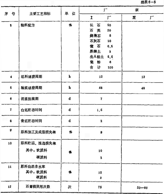 表6-5 卫生陶瓷厂工艺参数