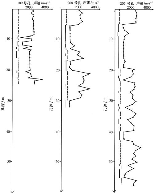 长江三峡链子崖50000方危岩体防治工程,采用锚索加固处理,锚固孔深30~40m不等,最深达64.2m。危岩体主要以栖霞灰岩为主,裂隙发育且为张性,局部成破碎软弱带。锚固施工需掌握上述裂缝、软弱结构面在锚固孔中的位置,分布及几何尺寸。地质矿产部水文地质工程地质技术方法研究所承担此项特种检测任务,研制一发一收干耦合换能器,在不能存留井液的水平干孔中,完成了共2670m的测试,指导了施工。图1-6其中三个钻孔的测试结果,其中视声速低于1000m/s(图中粗实线部分)的低速孔段均为裂隙及裂隙密集带(展建设、曹修定实测,1996)。