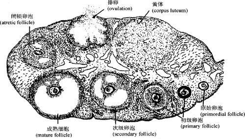 释义 | 卵巢 卵巢(ovary)可产生卵子和分泌女性激素,是一对扁椭圆形的器官,位于小骨盆侧壁内、外动脉分叉处的卵巢窝(ovarian fossa)。可分为内、外侧面,前、后缘和上、下端。前缘借卵巢系膜(mesovarium)连于子宫阔韧带,其中部有血管、神经、淋巴管出入,称卵巢门(hilum of ovary)。卵巢上端借卵巢悬韧带(suspensory ligament of ovary)连于小骨盆侧壁;下端以卵巢固有韧带(proper ligament of ovary)连于子宫底的外侧面。卵巢表面被覆一层立方形或扁平形的表面上皮,上皮下方有薄层致密结缔组织,称白膜。卵巢实质分皮质和髓质两部分。皮质位于周围,含有不同发育阶段的卵泡,少量黄体和富含网状纤维、梭形细胞的结缔组织。髓质位于中央,由疏松结缔组织组成,内含丰富的弹性纤维、血管、淋巴管和神经(图14-12)。卵巢门部有少量平滑肌和门细胞(类似睾丸的间质细胞),分泌雄性激素。 图14-12 卵巢模式图 (一)卵泡的发育和成熟 出生时两侧卵巢约含70万~200万个原始卵泡,到青春期约有4万个。从青春期至绝经期30~40年的生育时期内,卵巢在促性腺激素作用下,每月约有15~20个卵泡生长发育,但一般只有一个卵泡发育成熟。卵泡在成熟过程中逐渐靠近卵巢表面,大约14天左右成熟而排卵(ovulation)。女性一生共排卵约400~500个,其余的卵泡在发育不同阶段,先后退化为闭锁卵泡(atretic follicle)。 卵泡(ovarian follicle)是由中央一个较大的卵母细胞(oocyte)和周围一些卵泡细胞(follicle cells)组成。在卵巢内历经原始卵泡(primordial follicle)、生长卵泡(growing follicle)和成熟卵泡(mature follicle)等几个生长发育阶段。 1.原始卵泡(primordial follicle) 位于卵巢皮质浅部,数量多,体积小。由中央一个初级卵母细胞(primary oocyte)和周围单层的卵泡细胞组成。初级卵母细胞是胚胎时期由卵原细胞分裂分化而来,出生后,初级卵母细胞处于第一次成熟分裂的前期,到排卵前才进行并完成第一次成熟分裂。卵泡细胞较小,呈扁平形,围绕在卵母细胞周围,具有支持和营养卵母细胞的作用。 2.生长卵泡(growing follicle) 由原始卵泡发育形成。包括初级卵泡和次级卵泡两个阶段。初级卵泡,初级卵母细胞体积增大,卵泡细胞由单层扁平变为立方形或柱状,并增殖成多层。卵母细胞和卵泡细胞之间出现透明带(zona pellucida),它是卵泡细胞和初级卵母细胞共同分泌形成的。初级卵泡继续生长成为次级卵泡,这时卵母细胞体积更大,卵泡细胞层数增多,并在卵泡细胞之间出现一个新月形的腔,称为卵泡腔(follicullar antrum)。腔内充满卵泡液,是由卵泡细胞分泌液和卵泡膜血管渗出液组成。随着卵泡液的增多及卵泡腔的扩大,卵母细胞被推向卵泡的一侧,并与周围的卵泡细胞一起突向卵泡腔,形成卵丘(cumulus oophorus)。紧贴透明带的一层柱状卵泡细胞呈放射状排列,称放射冠(corona radiata)。分布在卵泡腔周围的卵泡细胞构成卵泡壁,称为颗粒层(stratum granulosum)。卵泡周围结缔组织形成的卵泡膜分为内、外两层。内层细胞较多,具有类固醇激素细胞的结构特征,周围有丰富的毛细血管;外层由结缔组织构成,胶原纤维较多。 3.成熟卵泡(mature follicle) 是卵泡发育的最后时期。卵泡体积很大,并向卵巢表面突出。此时的初级卵母细胞又恢复成熟分裂,在排卵前36~48小时完成第一次成熟分裂,产生一个次级卵母细胞(secondary oocyte)和一个很小的第一极体(first polar body)。 (二)排卵和黄体形成 成熟卵泡破裂,卵母细胞及周围的透明带和放射冠随同卵泡液一起自卵巢排出的过程,称为排卵(ovulation)。排卵时间约在月经周期的第14天。排卵后残存的卵泡发育为一个体积较大并含丰富血管的内分泌细胞团,新鲜时呈黄色,称黄体(corpus luteum)。它包括粒黄体细胞(granular lutein cell)和膜黄体细胞(theca lutein cell)。粒黄体细胞由颗粒层细胞分化而来,膜黄体细胞由卵泡膜细胞分化形成。黄体细胞可分泌孕激素和雌激素。在排卵后7~8天黄体发展到顶峰。若排出的卵未受精,黄体在排卵后12~14天开始退化、变性、纤维化而转变成白体(corpus albicans)。若排出的卵受精,黄体继续长大,发育成妊娠黄体(corpus luteum of pregnancy),一直维持到妊娠5~6个月,以后也退化为白体。卵细胞自卵巢排出,经输卵管腹腔口进入输卵管,在管中如遇精子即可受精,受精卵被送至子宫,植入子宫内膜,发育成胎儿。 卵巢的大小和形态随年龄而变化,幼女卵巢较小,表面光滑,性成熟期卵巢最大,以后由于多次排卵形成瘢痕,表面显得凹凸不平,35~40岁开始缩小,50岁左右逐渐萎缩。 (三)卵巢的内分泌功能 卵巢主要分泌两种激素,雌激素和孕激素,另外还有少量雄激素。 1.雌激素(estrogen) 卵泡、黄体均可分泌雌激素。人体内的雌激素主要是雌二醇(estradiol),其效力最强。雌激素的主要作用如下: (1)刺激女性附性器官的发育,并维持它们处于成熟状态:①使子宫肌肉增厚,并使子宫内膜呈增殖型变化。②使阴道上皮增生、角化,并合成大量糖原,糖原分解时阴道呈酸性(pH4~5),利于阴道乳酸菌的生长,而不利于其他细菌生长繁殖,增加阴道抵抗细菌的能力。老年妇女卵巢萎缩,雌激素分泌减少,阴道上皮变薄,糖原合成减少,阴道抵抗力下降,易感染发生老年性阴道炎。③使子宫和输卵管平滑肌的运动增强,影响卵子和精子的运输。④刺激乳腺导管上皮增生。 (2)激发和维持女性副性征。 (3)维持正常的性欲。 (4)促进肾小管对Na+、H2O的重吸收,增加