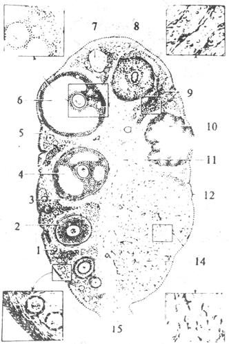 释义 | 卵巢发育及排卵 卵的发育、成熟、排卵及黄体的形成是生殖过程的重要环节,这些过程都是在卵巢完成的。 一、卵巢的机能解剖 卵巢位于盆腔内子宫两侧的后上方,呈卵圆形,左右各一,约3×2×1厘米。卵巢通过系膜、韧带与子宫相连,并悬于小骨盆的侧壁上。 卵巢表面覆盖着单层立方或扁平上皮,叫做生殖上皮,上皮内面有一层致密结缔组织的纤维膜,称为白膜。卵巢的实质分为皮质和髓质两部分,皮质在外;髓质在内。卵巢皮质中有各期发育中的卵泡,髓质中无卵泡,由疏松结缔组织、血管、淋巴管和神经组成(图2-2-1)。 图2-2-1 卵巢剖面模式图 1.原始卵泡;2.生长中卵泡;3.卵泡被膜;4.发育中卵泡;5.白膜;6.格雷夫氏卵泡(成熟卵泡);7.白体;8.闭锁卵泡;9.间质组织;10.破裂卵泡;11.卵巢髓质;12.生殖上皮;13.黄体;14.退化的黄体;15.卵巢门 二、卵泡发育及成熟 卵巢是卵生成的地方。卵巢表面的一层生殖上皮细胞为卵泡的来源。生殖上皮在卵巢的表面繁殖形成一团上皮细胞,深入皮质。其中有一部分发育为较大的细胞,即卵原细胞。其他变为扁平的小细胞,称为卵泡细胞,包围着卵原细胞。卵原细胞及其周围一层的扁平细胞共同构成一个原始卵泡(图2-2-1)。 在胚胎发育的第二个月时,生殖细胞经有丝分裂产生总数达26万个卵原细胞。迅速的有丝分裂繁殖持续进行,并且在第20周时随着第一次减数分裂,形成了6~7百万个卵母细胞。出生时,卵母细胞总数减少到1百万个左右,青春期时进一步减少到50万个,到绝经时仅有几百个。 青春期后,在脑垂体的卵泡刺激素的作用下,卵泡开始发育,卵不断地增大,卵细胞外面出现一层透明带,卵外的颗粒细胞也不断增生,由一层变为多层,并在细胞群中出现空隙,空隙中有颗粒细胞所分泌的卵泡液。随着卵泡液的增多,卵泡中的空隙增大,形成了一个卵泡腔,并把卵挤到卵泡的一侧,形成卵丘。在卵泡发育过程中,围绕卵泡的卵巢间质形成一个特殊的卵泡膜。充分发育的卵泡的卵泡膜又分化成两层:内层由多角细胞组成,称为内膜;外层由梭形细胞组成,称为外膜。一个成熟的卵泡直径约为10~16毫米,常常突出于卵巢表面。发育成熟的卵泡由外向内可分为:外膜、内膜、颗粒细胞层、透明带、卵(图2-2-2)。 图2-2-2 接近发育成熟的格雷夫氏卵泡 可见内被膜发育良好,围绕卵母细胞的卵丘细胞已开始形成放射冠,而且细胞核正发育至成熟分裂复始前阶段 在一个月经周期中,卵巢内常有几个甚至十几个卵泡同时发育,但往往只有一个卵泡发育成熟,其余的卵泡在发育的不同阶段先后退化,其机理目前尚不完全清楚。 三、排卵及其监测 卵泡破裂,卵和它周围的一些细胞(放射冠)一起被排出卵泡,这个过程称为排卵。排卵是形态学、生理学和生物化学复合变化的结果,这些变化受到神经、内分泌、代谢以及神经血管机理的影响。 1.排卵的机理 随着卵泡的成熟,卵泡腔逐步扩大,卵泡逐渐靠近卵巢的表面,最后卵泡和腹腔之间只隔着一层细胞和少量结缔组织。排卵前,卵泡壁有一部分变得特别薄,并显得特别突出。排卵时,卵泡就从这里破裂。由于随卵泡成熟卵泡液逐步增加,因此,有人设想,在卵泡成熟时,形成大量的卵泡液使卵泡压力增加,从而导致卵泡破裂发生排卵。但是,近年在实际测量卵泡内压时发现,接近排卵时卵泡内压无明显增高,甚至稍稍下降。经腹腔镜直接观察,发现排卵是一个较为缓慢的过程,从卵泡破裂到卵排出往往需要几分钟。这说明,排卵并非由于卵泡内压力增高,将卵泡壁挤破,卵与卵泡液一起突然被排出的过程。目前认为,卵泡破裂更可能是受到排卵酶的作用。当卵泡接近破裂时,卵泡壁的抗张强度下降,而各种蛋白分解因子都能使抗张强度降低。在卵泡液中已经检出了许多种酶,它们可能参与卵泡破裂过程。卵泡顶部发生的缺血可能进一步促进这一过程。前列腺素也与卵泡破裂过程有关。接近排卵时,卵泡液中前列腺素的浓度显着增高。卵泡可以主动地合成前列腺素。消炎痛不仅抑制前列腺素的合成,而且也抑制卵巢的收缩性并阻断排卵。此外,前列腺素FZα有使溶酶体失稳定的作用。这些都说明前列腺素也参与排卵过程,它很可能是引起卵泡壁及其微环境抗张强度降低的主要因素。 从卵巢外的调节机理看,卵泡发育受到腺垂体的促卵泡激素(FSH)和促黄体生成激素(LH)的促进。排卵前的LH峰起到触发排卵和促进黄体形成的重要作用。已证明,LH使卵巢的cAMP(环腺苷酸)增加,后者又能刺激前列腺素形成。LH促进孕酮的合成及分泌,而孕酮能触发排卵酶的形成和释放。用氰酮阻断孕酮的合成,同时也就阻断了LH的触发排卵作用。 垂体的两种促性腺激素(FSH、LH)的合成和分泌又受到下丘脑促性腺激素释放激素(GnRH)的调控和卵巢分泌的雌激素及孕激素的反馈调节。雌激素通过负反馈作用抑制FSH的分泌;而对LH的分泌有双重作用,小剂量促进LH的分泌,月经中期的雌激素水平升高可经正反馈作用引起排卵前的LH峰。但是,当雌激素的含量超过一定水平,特别是与孕酮协同时(如在黄体期中)则可通过负反馈抑制FSH和LH的分泌。显然,只要阻碍卵成熟或排出便可达到避孕的目的。目前常用的口服避孕药就是利用雌、孕激素对下丘脑和垂体的负反馈作用而抑制卵的成熟和排卵。 2.排卵的监测 排卵的唯一直接证据是从雌性生殖道中回收到卵子或是发生妊娠。对
