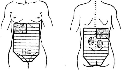 释义 | 卵巢癌 卵巢恶性肿瘤在女性生殖器官肿瘤中较为常见,据统计占第三位。因癌瘤深居盆腔,早期无症状,又无特异性的诊断方法,在患者就诊时常已属后期,故疗效不佳,预后较差,五年生存率仅有30%左右。 13.5.1 组织分类 卵巢原发性肿瘤种类甚多,对其分类方法还有很多争论,1973年世界卫生组织提出按组织发生分为四大类。 (1)来源于生发上皮肿瘤 如浆液性囊腺癌、粘液性囊腺癌、宫内膜样癌等。此类较多见。 (2)来源于性细胞的肿瘤 如恶性畸胎瘤、无性细胞瘤、绒毛膜上皮癌、内胚窦瘤等。 (3)发生于特异性性腺间质的肿瘤 如颗粒细胞瘤、卵泡膜细胞瘤、睾丸母细胞瘤等。 (4)发生于非特异性性腺间质的肿瘤 如肉瘤等,此类较少见。 13.5.2 扩散和转移 (1)直接蔓延或种植 癌穿破包膜直接侵犯或种植于邻近器官及盆腔内。 (2)淋巴道转移 可转移至盆腔及腹主动脉旁淋巴结,甚至锁骨上淋巴结。 (3)血行转移 可转移至肺、肝、脑等。 13.5.3 临床症状 早期无异常表现,肿块较大或期别较晚的可有以下症状: (1)腹胀及腹块 病人感腹胀,自己触及腹块,诉说腹围增大。 (2)压迫症状 腹块大或腹水多时病人感下坠,大小便困难或频数。 (3)内分泌异常 如性早熟,绝经后再出血,或不规则阴道出血等。 (4)腹痛 有合并感染、破裂或转移时可有剧烈腹痛。 (5)晚期病例转移症状 如肺转移有胸痛、咳嗽等。 13.5.4 诊断 (1)根据上述症状。 (2)妇科检查 可触及盆腔或腹腔肿块。恶性者一般为实质性,外形常不规则,晚期者不甚活动,常合并有腹水。 (3)B型超声波检查 可了解肿块大小,性质和周围脏器的关系,并可区别腹水和肿块等。 (4)腹部X线平片 可见卵巢肿瘤软组织阴影和某些肿瘤的特殊表现,如畸胎瘤的骨骼等。 (5)腹腔穿刺抽腹水查癌细胞。 (6)内分泌检查 如查HCG、雌激素水平等,可以诊断和内分泌有关的肿瘤。 (7)CT检查 了解肿块大小、位置和周围脏器的关系。 13.5.5 卵巢肿瘤的临床分期 按国际妇产科联合会提出的分期标准可分为四期: Ⅰ期:肿瘤限于一侧卵巢或双侧卵巢 Ⅰa期:肿瘤限于一侧卵巢无腹水 Ⅰb期:肿瘤限于两侧卵巢无腹水 Ⅰ。期:肿瘤限于一侧或双侧卵巢有腹水 Ⅱ期:肿瘤位于一侧或双侧卵巢并有盆腔转移 Ⅱa期:转移到子宫或输卵管 Ⅱb期:侵犯其它盆腔组织 Ⅲ期:肿瘤位于一侧或双侧卵巢并有腹腔以内的转移(如大网膜、肠系膜等) Ⅳ期:肿瘤位于一侧或双侧卵巢并有腹腔以外的远处转移 以上分期以第一次手术所见的为准。 13.5.6 治疗 以手术为主要治疗手段,合并化疗或放疗。 (1)手术治疗 明确诊断后应尽早手术,即使已属晚期患者,只要一般情况许可亦应尽快行剖腹探查术,力争彻底切除肿瘤及转移灶,包括全子宫及附件、大网膜、阑尾等。 (2)放疗 放疗是卵巢癌的主要辅助治疗手段之一。通过对局部肿瘤照射,达到消灭和控制肿瘤的作用,对有些高度敏感的肿瘤,如无性细胞瘤、颗粒细胞瘤可以单行放疗。一般只能配合手术行术前、术后和姑息性放疗。术前放疗可使肿瘤缩小,减少粘连和术中出血,提高切除率。术前放疗多用于肿块较大、固定、手术难以切除者,可以在2周内给予DT2000cGy,休息两周,而后手术切除。实际上术前诊断不易,所以术前放疗进行的亦少。 临床上主要采取术后放疗,一般术后1~2周开始,消除残留或亚临床病灶。对晚期和复发病灶的放疗,可达到姑息治疗的目的。锁骨上、腋下、腹股沟等处转移灶,也可采用局部放疗,在4~6周内给DT4000~6000cGy。 全腹照射:卵巢癌常有盆、腹腔内广泛种植,照射应包括全盆、腹腔,上至横膈,下至盆底,可用大野照射(图13-5)或2~4个小野,前后对穿,5~6周内给DT2000~3000cGy。该方法照射病人反应较大,伴有恶心、呕吐、腹泻、血象下降等表现,甚至因放射反应重而被迫中断治疗。肾脏受量应不超过1700cGy,肝脏不超过2500~3000cGy。超过上述剂量,应予以遮挡。 图13-5 卵巢癌全腹照射 全腹移动条形野照射:此方法可减少副反应,提高照射量,增加生物效应。方法是将原前后野分割成多个2.5cm宽的连续条形野,右肝区前后各用一个半价层(1HVL)铅遮挡,而两肾后野用两个半价层(2HVL)铅遮挡,前后对穿照射。照射从最下一个条形野开始,逐渐上移,每日照射一条,前后轮照,每两日各向上移动一条,当各达到4个条形野时,即10cm,每日向上移1条,其下舍弃一条,直至达最上4条野,而后每日舍弃一条,至最后一条(图13-6)。 图13-6 卵巢全腹移动条照射 腹部移动条野照射时,在校正深度量和半影效应后,在12天内,接受8次照射,4次半影照射后,肿瘤剂量可达到2600~2800cGy,总疗程需50~60天。此方法有每次照射面积小,总剂量完成快,边缘效应小、副反应小、肿瘤生物效应高等特点。 该方法主要副反应有恶心、腹泻,开始两周,白细胞和血小板明显下降,以后缓慢上升,至治疗结束可恢复正常。 盆腔照射:一般上界为脐孔,下界为盆底。肿瘤剂量DT4000~5000cGy,每日200~250cGy,6~8周内完成,前后对穿照射,照射野可采用长方形野17×20cm。具体照射野大小可根据病人体形而异。若姑息照射盆腔较大肿块时,当肿瘤剂量达DT3000~4000cGy,肿瘤体积明显缩小时,为减少放射损伤和增加疗效,可缩野,针对肿块追加剂量,总肿瘤量DT可达5500~6000cGy。 全腹加全盆照射:因为卵巢癌患者有盆、腹腔内广泛种植的可能,特别是Ⅱ、Ⅲ期患者在术后应追加全腹加全盆照射。全腹应用移动条形野给肿