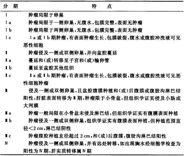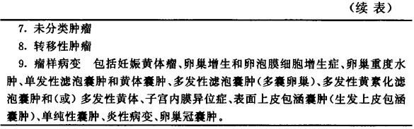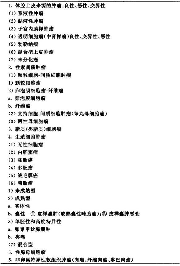 释义 | 卵巢肿瘤 卵巢肿瘤是女性生殖器三大恶性肿瘤之一,由于子宫颈癌及子宫内膜癌的诊疗进展,卵巢癌的诊疗无突破性的进展,存活率仍较低,徘徊于30%左右。 卵巢组织复杂,各种肿瘤均可发生,并有良性、交界性及恶性之分。临床上患者自己就医时,往往已属晚期,应加以警惕。 卵巢肿瘤的分类方法很多,现依高等医药院校教材(第五版)介绍。WHO1972年以卵巢组织的发生学,良性及恶性为基础,制定了国际统一的卵巢肿瘤组织学分类法。卵巢肿瘤组织学分类,见表1.5.4。 表1.5.4 卵巢肿瘤组织学分类 原发性卵巢恶性肿瘤分期(FIGO)见表1.5.5。 表1.5.5 原发性卵巢恶性肿瘤分期(FIGO,1985) 注 Ⅰc及Ⅱc如细胞学阳性,应注明是腹水还是腹腔冲洗液;如包膜破裂,应注明是自然破裂或手术操作时破裂 【诊断】 1.临床表现 (1)症状 早期无症状。良性肿瘤由于肿瘤压迫而造成各种不适,恶性肿瘤常发病迅速,肿块增大明显,压迫症状明显而不适或疼痛,甚至可有下肢水肿。胸水或及腹水为常见的晚期症状,当肿瘤破裂或扭转时可出现腹痛。晚期常呈恶液质现象,一般明确诊断往往已属晚期。 (2)体征 妇科双合诊及三合诊检查时,阴道穹隆触及高低不平的固定肿块结节,伴腹水。 2.辅助检查 (1)细胞学检查 腹水或腹腔冲洗液查找肿瘤细胞。 (2)细针穿刺活检 直接穿刺肿瘤标本检查,协助诊断。 (3)B超检查 能测肿瘤大小、部位、形态及性质,可提示肿瘤的性质并协助作鉴别诊断。 (4)放射学诊断 畸胎瘤盆腔内可见骨质类表现及囊壁密度增高的钙化层,囊腔呈放射透明状阴影。各种造影可协助诊断肿瘤的病理及追查病因,淋巴造影可诊断有无淋巴转移,提高分期诊断的正确性。CT及MRI检查更能诊断了解肿瘤发展的情况。 (5)腹腔镜检查 可直视检查并了解整个盆腹腔被肿瘤侵占的情况。但巨大的肿块或粘连者禁忌检查。 (6)肿瘤标志物检查 近年发展很快,常用的有CA125,AFP,CEA,LDH,hCG,胎盘碱性磷酸酶,端粒酶等等。结合各种肿瘤,若查到阳性,则为以后随访是否复发有着一定的帮助。 妇科肿瘤标记物的临床简介如下: 1)hCG 通常在滋养叶细胞肿瘤的诊断随访中起着极重要的作用。在卵巢肿瘤中,卵巢非妊娠性绒癌,精原细胞瘤的恶性病变,少数胚胎性肿瘤亦可阳性。 2)AFP 卵巢内胚窦瘤可阳性,可作为诊断治疗后的随访指标。 3)CA125 作为卵巢癌肿的诊断应用,尤在上皮类癌肿中,阳性率高,观察其动态变化,可作为诊治后随访的指标。 4)CA199 在妇科肿瘤中常用在子宫内膜癌的辅助诊断,但在卵巢癌中,CA199亦会有升高现象,尤内膜样癌时阳性率较高。 5)胎盘碱性磷酸酶(PLAP) 有报道用在宫颈癌及卵巢的诊断中,可有30%~60%的患者出现阳性。 6)抑制素(Inhibin) 为颗粒细胞所产生,在颗粒细胞瘤时上升,可用于颗粒细胞瘤的诊治随访的监察手段。 7)LDH 卵巢恶性精原细胞瘤时上升。 8)LSA 在卵巢癌中70%可阳性,宫颈癌中63%阳性,内膜癌中43%阳性,可配合CA-125同时监察卵巢上皮类肿瘤。 9)NB-7OK 所有的上皮类卵巢肿瘤可出现升高现象,配合CA125可能会增加卵巢癌的诊断率。亦有提出CA125配合CA72,CA15-3同时检测以协助诊断。 10)端粒酶 有提出对卵巢癌的诊断有其一定的地位。 3.鉴别诊断 (1)良性应与瘤样病变、子宫肌瘤、妊娠、其他病变引起的腹水相鉴别。 (2)恶性时应与子宫内膜异位症、盆腔结缔组织炎、结核性腹膜炎、生殖道外肿瘤、转移性卵巢肿瘤相鉴别。 4.并发症 (1)蒂扭转 最为常见的并发症,常发生于中等大小,蒂较长的囊肿,因此,皮样囊肿最易发生扭转,典型症状为突发性肿瘤侧剧而持续的腹痛,伴恶心、呕吐甚至休克。妇科检查可及一张力大、压痛或伴肌紧张的盆腔肿块,扭转后易坏死、出血、感染及破裂,故应即刻手术,术中应在蒂下钳夹,防止血栓脱落的危险。 (2)破裂 可自然破裂、外伤性破裂或并发于扭转坏死后的破裂。常伴有剧烈腹痛、恶心、呕吐,检查时腹部肌紧张,可伴腹水症,而原有肿块缩小或消失,边界不清。 (3)感染 可来源于附近器官或肿瘤本身扭转后,亦可来自血行或淋巴结的感染,临床表现为发热、腹痛、肌紧张,类似急性盆腔炎的体征。 (4)恶变 卵巢肿瘤均有恶变可能,早期无症状,等出现症状,往往已属晚期,为此,应定期普查,卵巢有异常增大,即应提高警惕及时诊治为是。 5.卵巢肿瘤的临床特点 (1)卵巢上皮性肿瘤 占原发性卵巢肿瘤的60%~70%,此类肿瘤有良性、交界性及恶性之分。交界性是一低度潜在恶性肿瘤,生长缓慢,转移率低,复发较迟。 (2)良性上皮性肿瘤 约占所有卵巢肿瘤的75%,大多呈囊性。 1)卵巢浆液性囊腺瘤 最常见,多为囊性,单房,可为双侧性,恶变率达30%~50%,囊壁内有乳头状生长者为乳头状浆液性囊腺瘤,常为多房,恶变可能性大,常穿破囊壁种植他处,常伴有腹水,即使组织学仍为良性,其生物行为已属恶性,镜下囊壁内衬单层立方形或柱状上皮,间质内可见沙粒体。 2)卵巢囊腺纤维瘤 为浆液性囊腺瘤的变型,多发生于60岁左右。 3)卵巢黏液性囊腺瘤 多见于生育年龄。多为单侧,偶可双侧性。特点为囊腔为多发性,大小不一,腔内充满胶冻样黏液,部分可合并乳头状物,称黏液性乳头状囊腺瘤。可自行穿破而种植腹膜,成为腹膜黏液瘤。 4)卵巢内膜样肿瘤 良性、交界性少见,是否与子宫内膜异位症有关,尚无统一意见,恶性为卵巢内膜样癌,镜下与子宫内膜癌十分相似。 5)纤维上皮瘤 又称勃