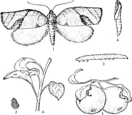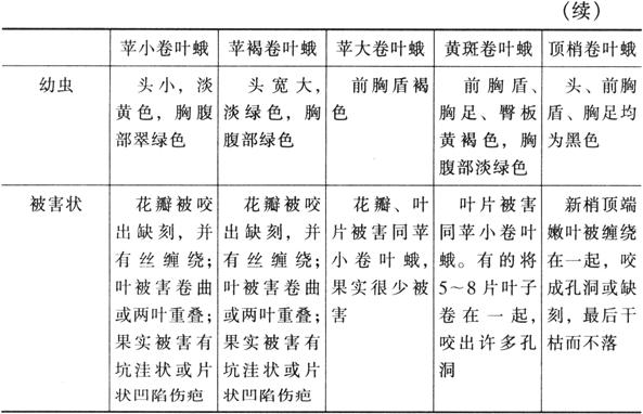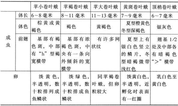释义 | 卷叶蛾类 为害苹果的卷叶蛾主要有苹小卷叶蛾、苹褐卷叶蛾、苹大卷叶蛾、黄斑卷叶蛾、顶梢卷叶蛾5种。其中苹小卷叶蛾分布广,为害重,其次是苹褐卷叶蛾。这两种卷叶蛾的幼虫啃食果实,果实被害率可高达50%。苹大卷叶蛾发生较少。黄斑卷叶蛾在荒芜的山地果园发生较严重,管理好的果园很少见。顶梢卷叶蛾主要对幼树为害严重。5种卷叶蛾的识别特征如表1-2: 表1-2 5种卷叶蛾的识别特征 1.苹小卷叶蛾 苹小卷叶蛾属鳞翅目卷叶蛾科,俗称苹卷蛾、棉卷蛾,分布范围广,主要为害苹果、沙果、桃、梨、李等果树,以幼虫为害叶片和果实,被害率达40%以上。 【形态特征】: 成虫:体长6~8毫米。体黄褐色。前翅的前缘向后缘和外缘角有两条浓褐色斜纹,其中一条自前缘向后缘达到翅中央部分时明显加宽。前翅后缘肩角处,及前缘近顶角处各有一小的褐色纹。 卵:扁平椭圆形,淡黄色半透明,数十粒排成鱼鳞状卵块。 幼虫:身体细长,头较小呈淡黄色。小幼虫黄绿色,大幼虫翠绿色。蛹黄褐色,腹部背面每节有刺突两排,下面一排小而密,尾端有8根钩状刺毛(图1-13)。 图1-13 苹小卷叶蛾 1.成虫 2.卵 3.幼虫 4.蛹 5、6.被害状 成虫:全身黄褐色或暗褐色,前翅基部有一暗褐色斑纹,前翅中部前缘有一条浓褐色宽带,带的两侧有浅色边,前缘近端部有一半圆形或近似三角形的褐色斑纹,后翅淡褐色。 卵:扁圆形,长约0.9毫米,初为淡黄绿色,近孵化时变褐;数十粒排成鱼鳞状卵块,表面有胶状覆盖物。 幼虫:体灰绿色,后缘两侧常有一黑斑。 蛹:长约11毫米。头和胸部背面暗褐色稍带绿色,腹部背面各节有两排刺突。 成虫:小型蛾类。身体灰褐色。前翅近长方形,暗灰色,前缘有数条并列向外斜伸的白色短线,后缘外侧1/3处有一块三角形暗色斑纹,静止时并成菱形,外缘内侧前缘至臀角间有5~6条黑褐色平行短线。 卵:扁平,椭圆形,黄白色,有光泽。 幼虫:体形粗壮,头、前胸背板及胸足漆黑色,身体污白色。越冬幼虫淡黄色。 蛹:纺锤形,黄褐色。茧黄白色,长椭圆形。 【发生规律】: 苹小卷叶蛾一年发生3~4代,辽宁、山东3代,黄河故道和陕西关中一带可发生4代。以幼龄幼虫在粗翘皮下、剪锯口周缘裂缝中结白色薄茧越冬。第二年苹果树萌芽后出蛰,金冠品种盛花期为出蛰盛期,并吐丝缠结幼芽、嫩叶和花蕾为害,长大后则多卷叶为害,老熟幼虫在卷叶中结茧化蛹。3代发生区,6月中旬越冬代成虫羽化,7月下旬第一代羽化,9月上旬第二代羽化;4代发生区,越冬代为5月下旬、第一代为6月末至7月初、第二代在8月上旬、第三代在9月中羽化。成虫寿命6~7天,卵期变化大,春秋季为10天左右,夏天只有6天,幼虫期约为半个月,蛹期为6~10天不等。 成虫有趋光性和趋化性:成虫夜间活动,对果醋和糖醋都有较强的趋性,设置性信息素诱捕器,均可用来直接监测成虫发生期的数量变化。 雌虫多在叶片上产卵,也有产在叶背及果面上的,每雌产卵可达几百粒。幼虫非常活跃,触动卷叶,幼虫常吐丝下垂,接到手掌中则迅速扭转跳动或后退逃逸。 每年发生2~3代,辽宁、甘肃每年发生2代;河北、山东、陕西每年发生3代,以幼龄幼虫在树干粗皮、剪锯口裂缝内做白色薄茧越冬。苹果树开始萌芽时,越冬幼虫出蛰,食害幼嫩的芽、叶和花蕾,受害叶表面被咬成箩底状,仅剩叶脉,影响正常生长。5月中、下旬至6月上旬幼叶卷叶为害。6月中旬老熟幼虫在卷叶内开始化蛹,蛹期为8~10天。6月下旬至7月中旬羽化为成虫。成虫有趋化性和弱趋光性,夜间交尾产卵,卵期7~8天。第一代幼虫在7月中旬开始发生,食害叶肉,舔食果实。果实被害后,果面出现不规则凹陷伤疤,幼虫长大后分散活动,如遇惊动即吐丝下落。第二代幼虫在9月上旬发生,为害时间较短,于10月中上旬寻找越冬场所。成虫对糖醋具有趋化性。主要天敌有松毛虫赤眼蜂。 顶梢卷叶蛾一年发生2代,以2~3龄幼虫潜伏在被害的梢内做茧越冬。第二年4月上、中旬开始活动为害,5月中旬至6月中旬化蛹,5月下旬至7月上旬成虫陆续羽化,在叶背产卵,卵期10天。第一代幼虫7月发生最多,7月中下旬老熟化蛹,7月下旬至8月底成虫出现;第二代幼虫于8月上旬至9月上旬发生并继续为害,至10月在顶梢卷叶内做茧过冬。幼虫为害时,吐丝缠连梢上嫩叶,新梢生长点被破坏后生长受到抑制,往往新梢生长偏向一边。成虫在叶背产卵,卵呈一粒一粒散产。 【防治方法】: (1)防治最佳时期 ①一年中仅早春幼虫出蛰期虫态较整齐,应加强前期(开花前后)的防治。 ②夏季第一代卵孵化的盛末期。 (2)防治方法 ①生物防治 苹小食心虫的天敌有几十种,其中以寄生卵的松毛虫赤眼蜂和寄生幼虫的甲腹茧蜂、卷叶蛾肿腿蜂、捕食性草蛉、狼蛛和白僵菌为最重要。 人工释放松毛虫赤眼蜂:用糖醋、果醋或苹小卷叶蛾性信息素诱捕器以监测成虫发生期数量消长。自诱捕器中出现越冬成虫之日起,第四天开始释放赤眼蜂防治,一般每隔6天放蜂一次,连续放4~5次,每公顷放蜂约150万头,卵块寄生率可达85%左右,基本控制其为害。 用生物制剂防治苹小卷叶蛾:在越冬代幼虫出蛰盛期和第一代幼虫初期,选用Bt乳剂200~400倍液、青虫菌、除虫脲1号、苏脲1号1000倍液防治,对初孵幼虫防治效果可达80%以上。 ②物理防治 利用成虫的趋化性,诱杀成虫:在树冠下挂糖醋液(糖∶酒∶醋∶水=5∶5∶20∶80),或果醋液(发酵后),或酒精液,或发酵豆腐水等。 