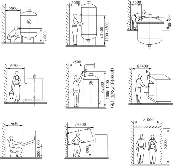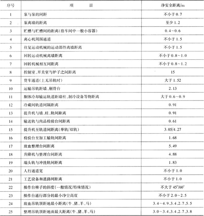 释义 | 厂房平面尺寸和高度 厂房平面的长宽尺寸及高度是指厂房内净长、宽、高尺寸分别再加墙厚顶棚厚的尺寸。厂房的内净长、宽、高尺寸的确定主要考虑: (1)生产工艺中各生产工序、工段必要的分隔墙、互通用的通道的尺寸。 (2)选用生产设备的长、宽、高尺寸及设备配置的数量。 (3)生产工艺对设备布置的要求,如设备操作应留的足够位置,设备维修需要的空间,设备之间安全间隔距离等。 (4)正常生产时人流、物流所需通道、运输方式、机械的尺寸和特性。 (5)为生产发展、产品变动、工艺流程变动适当预留余地。 (6)消防安全。 设备的安全距离,操作设备的最小间距,肉类加工车间的面积估算资料分别见表4-3-2、图4-3-1、表4-3-3、表4-3-4、表4-3-5、表4-3-6和表4-3-7所示。 表4-3-2 设备安全距离 图4-3-1 操作设备所需的最小间距/mm