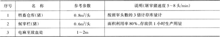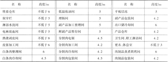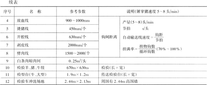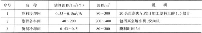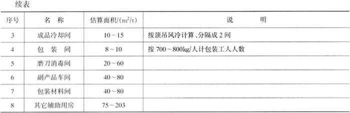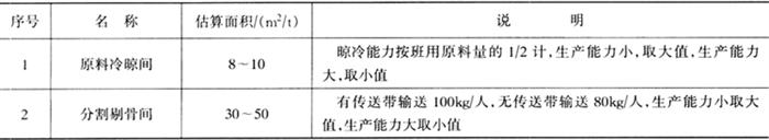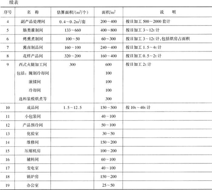 表4-3-3 班产5~20t分割肉加工车间面积估算 表4-3-4 班产5~20t肉制品加工车间面积估算 表4-3-5 生活设施面积计算 表4-3-6 屠宰间的长度 表4-3-7 厂房高度 |