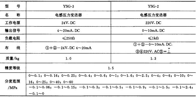 图9-11-9 9系列数字压力表外形尺寸图 4.生产厂家 西安仪表厂。 (三)YSG系列电感压力变送器 1.结构特点 本系列仪表主要适用于工业生产过程和测量系统中用以测量各种对铜或铁及其合金不起腐蚀作用的流体介质的压力或负压。本仪表既能将被测介质的压力值转换成标准直流电流信号,以便于较长距离传送测量值,而最终能在中央控制室中进行处理,以实现生产过程的自动检测与控制,又具有机械式指针直接指示压力值的特点,以便于现场工艺检查与调校。 2.主要技术参数 见表9-11-14。 表9-11-14 YSG系列电感压力变送器主要技术参数