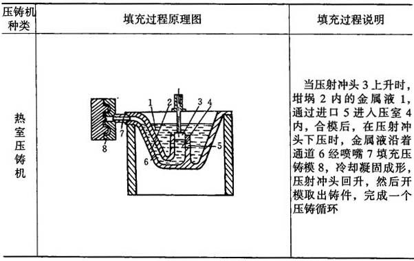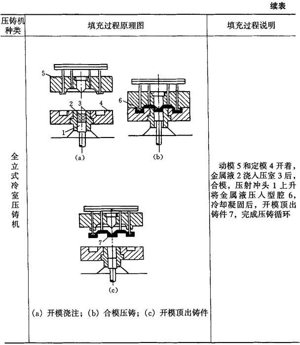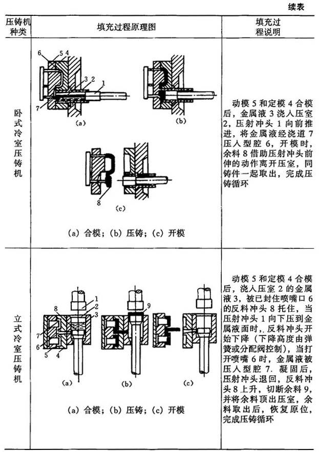 压铸过程原理见表5-109中图及说明.