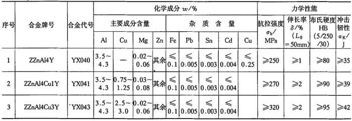 表5-110 压铸锌合金化学成分和力学性能(GB/T13818-92)