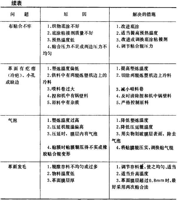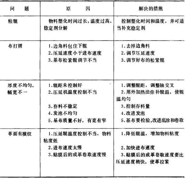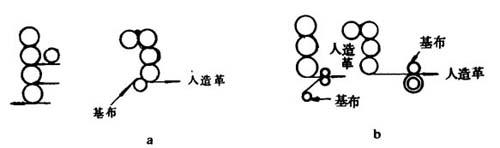 释义 | 压延法 压延法是指利用压延机成型人造革的方法。压延法生产聚氯乙烯人造革主要有两种方法,一是直接贴合法,即在压延成型时,直接利用压延机将物料擦到或贴合到引入基布上,制成聚氯乙烯人造革的方法;二是分步层合法,即先成型压延薄膜,然后再与基布贴合。本节介绍直接贴合法。 压延法可用于生产人造革和壁纸,且有发泡和不发泡两种。基材可用市布、帆布、针织布、玻璃布、不织布和纸。本节主要介绍布基人造革。 压延法人造革的优点是:①可以使用廉价的聚氯乙烯悬浮树脂;②加工速度快,一般为30m/min,高者可达50m/min;③物料与织物的复合较容易。缺点是投资较大。 (一)设备 1.压延机 生产聚氯乙烯人造革使用的压延机主要是三辊压延机和四辊压延机,详见第六章。 2.发泡烘箱 制造发泡压延人造革时,一般使用分段式烘箱。烘箱实例如下: 用途:衣料用压延人造革 使用发泡剂:偶氮二甲酰胺 三段烘箱总长:18m 烘箱温度控制: 第一段:190~200℃ 第二段:180~190℃ 第三段:170~180℃ 通过烘箱速度:18~22m/min(由发泡层厚度决定) (二)工艺 1.工艺流程 压延法生产聚氯乙烯人造革的工艺流程见图8-1-23。 图8-1-23 压延法聚氯乙烯人造革生产工艺流程示意图 2.基布底涂处理 基布底涂处理的目的是为提高基布与面层聚氯乙烯的贴合牢度,同时也可减小贴合压力,保证产品柔软。底涂处理通常是在基布上涂一层胶粘剂。 基布底涂方法有表涂和辊涂两种。图8-1-24所示是最简单的辊涂方法。 图8-1-24 基布的辊涂 底涂基布的上浆量对人造革质量有较大的影响,一般以基布上涂有薄薄一层浆料为最佳。上浆量过大,浆料过多地渗入到基布纤维的间隙中,就会使基布变硬,用这种基布生产出来的人造革缺乏弹性,不柔软。上浆量太小,又达不到上浆的目的。上浆量也与基布的质地有关,应视基布的品种不同而不同。一般利用底涂辊网纹密度来达到控制上浆量的目的。底涂辊网纹密度一般为120~130目。普通针织布底涂辊网纹密度可用100目。图8-1-25所示为基布底涂上浆情况示意图,其中a的上浆量最为适宜。底涂后的基布在必要时须经烘道干燥。 图8-1-25 基布底涂示意图 3.配方 聚氯乙烯人造革配方举例见表8-1-19。 表8-1-19 压延法人造革配方举例 4.塑炼 用压延法生产聚氯乙烯人造革时物料的塑炼工艺有多种流程,见图8-1-23,一般条件与压延薄膜的塑炼工艺类似,所不同的是人造革配方中增塑剂的含量较多,混炼时间要长一些。一般密炼温度为135~145℃,两辊炼塑机温度为140~150℃;当含发泡剂时,密炼温度不得超过140℃,两辊温度不得超过145℃,否则发泡剂会提前分解。 采用捏和两辊塑炼流程生产泡沫人造革时,混炼温度控制在130~145℃,并在混炼过程中掺入发泡剂,至物料均匀,即可进入下一工序。 5.压延成革 (1)压延成革方法 直接压延法生产聚氯乙烯人造革有擦胶和贴胶两种方法。擦胶法就是利用压延辊之间转速的不同,将物料擦到基布上制得人造革的方法。擦胶法生产压延人造革的优点是:因为物料擦到基布纤维的间隙中,增加了物料和基布的附着力,所以,贴合强度较高,基布可以不进行底涂处理;缺点是:擦到基布纤维间隙的物料使制品变硬,手感不太好。贴胶法是借助于贴合辊的压力,将成型物料和基布贴合在一起的成型方法。贴胶法生产的人造革因胶料只贴在基布的表面(图8-1-26)手感较好,但是必须对基布进行底涂处理,以增加贴合强度。图8-1-27所示为擦胶法与贴胶法贴合辊的速比示意。 图8-1-26 擦胶法与贴胶法贴合辊速比示意图 a-擦胶法 b-贴胶法 1-压延机辊筒 2-塑料 3-基布 4-人造革 图8-1-27 贴胶法示意图 a-内贴法 b-外贴法 贴胶法有内贴法和外贴法两种。内贴法是在物料引离压延机辊前,借橡胶贴合辊与压延机最后一个辊筒间的压力将布基贴合上去的方法。外贴法是待物料引离压延辊后,利用单独一组贴合辊加压进行贴合的方法(图8-1-28)。 内贴法使聚氯乙烯物料在辊上停留时间增加,从而提高贴合牢度,但橡胶贴合辊处在高温下工作,易发生变形,而外贴法可延长橡胶贴合辊的寿命。 (2)温度控制 压延温度与压延速度有关。关于温度控制可参考第六章第二节。生产压延人造革时辊温一般较生产薄膜时稍低一些,大约控制在140~155℃。增塑剂较多的物料或加有发泡剂的物料,辊温不得超过150C。 (3)存料控制 生产压延人造革时,辊隙存料对质量影响很大,必须严格控制。存料量根据物料厚度不同,一般膜厚越厚,存料要求越多。膜层厚0.1mm时,Ⅰ、Ⅱ辊间存料量为30~35mm,Ⅱ、Ⅲ辊间15~20mm,川、Ⅳ辊间10~15mm。膜厚0.5mm时,Ⅰ、Ⅱ辊间存料量为80~100mm,Ⅱ、Ⅲ辊间存料量30~40mm,Ⅲ、Ⅳ辊间存料量10~20mm。 (三)操作中出现的问题、原因和解决的措施 操作中出现的问题、原因和解决的措施见表8-1-20。 表8-1-20 操作中出现的问题、原因和解决的措施 |