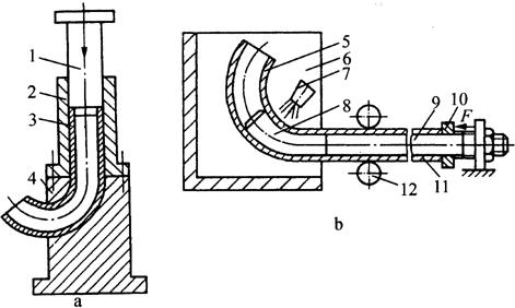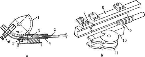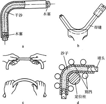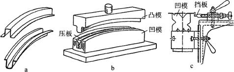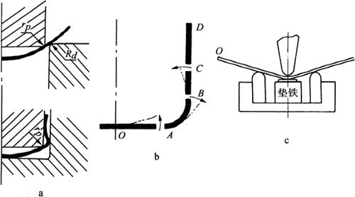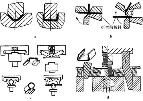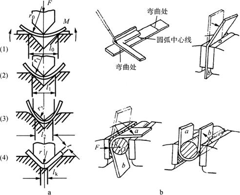 释义 | 压弯成型方法 压弯是利用机械装备或弯曲模在压弯机与折弯机上,将板材、型材或管材等弯曲成一定角度和曲率的加工方法。 生产中大多数钣金材料是在常温下进行压弯,即为冷弯成型,并以材料形状特点分为两大类;一类是板材与型材在压弯机、折弯机上使用专用模或通用模压弯成型,一类是管材等在弯管机等设备上使用工具压弯成型,如图9-2所示。 图9-2 压弯成型方法 a.专用固定模压弯 b.通用模折弯 c.摆动块式活动模压弯 d.斜楔式弯曲模压弯 (一)板材件压弯方法 1.板材件压弯过程及特点 板件在压力机上使用专用的V形或U形模进行压弯是最基本的弯曲形式,可将板材一次弯曲成V形或U形形状。但是,即便采用最简单的敞开式V形弯曲模压弯时,其变形过程也很复杂,如图9-3所示。 图9-3 板材件弯曲受力状况 a.V形弯曲 b.U形弯曲 1.凸模 2.凹模 弯曲开始时,模具的凸、凹模与板料在A、B处相接触,凸模在A处所施加的外力为2F(U形弯曲则为F),凹模面上的B处产生反作用力与外力构成弯曲力矩,即M=FL。 在弯曲力矩的作用下,板料在由弹性弯曲变形到塑性弯曲变形的过程中,开始时处于弹性变形阶段[图9-4a(1)],随着变形的不断加大,当达到一定值后,板料内外表面首先达到屈服点而开始塑性变形。 图9-4 板料弯曲过程 a.V形弯曲模压弯 b.钳台压弯 (1)开始受力 (2)二受力点移动 (3)三点接触与贴合 (4)完全吻合 随着凸模逐渐进入凹模,板料内外表面全部出现塑性变形,在凹模上的支撑点B(图9-3)将逐渐向模具中心移动[图9-4a(2)],同时弯曲力臂L和圆角半径r将逐渐减小,板料与凹模V形表面接触并逐渐靠紧,直到板料与凸模三点接触[图9-4a(3)]。 再继续下压凸模时,板料与凸模的接触点数目逐渐增多,凸模两侧与板料直边接触点,压迫板料直边部分向相反的方向变形,使两直边紧贴模具,且夹角与凸凹模圆角半径完全吻合[图9-4a(4)],弯曲过程便可结束。 2.V形压弯及回弹 在弯曲过程中,由于板料受力产生的变形由塑性变形和弹性变形两部分组成,所以当零件成型、去除外力后,板料中的塑性变形保留下来,弹性变形则会完全消失,致使弯曲后的工件各部分分别产生与加载变形方向相反的回弹变形。 如图9-5a所示,制件在弯曲终了时的角度为模具的弯曲角α,而实际回弹后弯曲角为α0(α0<α),弯曲半径由r变为r0。图9-5c所示,OA、AB、BC三段的回弹值综合作用决定工件的最终形状,其中OA的回弹值越大,越使工件角度大于模具角度。因此,在加载弯曲变形的同时,须考虑减小或补偿由回弹变形引起的误差,以保证弯曲件的精度。 图9-5 V形弯曲回弹 a.角度的回弹 b.弯边的变化 c.弯边的回弹(OA、AB、BC为不同段的回弹情况) 3.U形压弯及回弹 (1)自由法弯曲及回弹:如图9-6a所示,弯曲变形的初始阶段,模内不设置顶板,不施加与凸模作用方向相反的压力时,板料在凸模的作用下,中间非变形区OA部分首先产生弯曲变形,并以凸模圆角为中心向下翻转,凸模外部的板料两端向上翘起。当板料的两端进入凹模时,D点与凸模的侧面接触并被反向弯曲,最终OA部分在凸模与凹模之间被反向弯曲后压平(图9-6b)。 图9-6 U形弯曲过程及回弹 a.初始阶段与变形方向 b.最终阶段 c.背压弯曲 在弯曲过程中,不仅是凸模圆角与板料作用形成两个圆角区,而且非变形区OA、BC两部分也都不同程度地产生了变形。因此卸载时,变形区与非变形区都各自产生与加载时变形方向相反的回弹变形,变形区与非变形区回弹方向恰好相反,三部分回弹值的大小即可决定弯曲件的最终形状,以互相抵消获得的弯曲件精度最好。 (2)背压法弯曲及回弹:如图9-6c所示,若在模具内设置顶板且顶板的背压又足够大时,在弯曲的初始阶段OA部分被顶板紧压在凸模的端面上,使OA部分不产生变形(图9-6b)。因此在卸载时,OA部分不会引起弯曲件两壁向里闭合的回弹,所得弯曲件的角度会因变形区圆角部分的回弹而稍大于凸模的角度。 同时,若能适当调整顶板的背压和凸模下止点的位置,控制OA部分的弯曲变形与反向弯曲变形,使卸载时OA部分的回弹角恰好等于圆角部分的回弹角,就可以得到与凸模角度相一致的弯曲件。这种方法适用于弯曲系数较小的零件,其特点就是依靠毛坯中间部分的回弹补偿圆角部分的回弹值。 U形弯曲时,选择适当的弯曲力(校正力)、凸模与凹模间隙和凸模、凹模圆角半径均可以降低回弹值。 (二)型材件压弯方法 1.规则直型材件的压弯 如图9-7a所示,各种规则的直型材可以在压弯机上利用模具进行弯制。图9-7c为通用凹模的工作位置,通用凹模的四面开有不同尺寸的槽口,可以按工作需要进行选用。 图9-7 规则直型材件压弯模 a.两种框缘型材零件 b.弯曲模 c.通用凹模和挡板 通用挡板装在可移动调整的导轨上,可对不同尺寸的直型材弯曲时进行定位,通用凹模的下端面可以弯制波纹板,其弯制辅助装置及方法如图9-7b所示。 利用通用模可将规则直型材弯制成L形、V形、 图9-8 规则直型材件压弯过程 a.带凸缘的双角件 b.∑形件 c.带弯曲收口的双角件 2.不规则直型材件的压弯 不规则短型材的弯曲、长型材的局部或小半径的局部区域急剧折曲,应根据各自的工作要求,在液压机上利用专用压弯模进行压弯,如图9-9所示为不规则型材弯制零件时的模具及方法。 图9-9 不规则型材弯制零件及模具 a.专用模 b.零件 c.弯制过程 (三)角钢件的压弯 1.角钢件弯形分类 角钢件