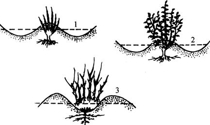1.堆土压条(图7-16) 该法常用于草樱桃砧木育苗。于冬春两季,从选好的母株基部堆起约0.33米高的湿土堆,促使基部萌蘖生根,形成新的植株。春季将生根的萌蘖从母株上剪下进行定植。应用此法每株可繁3~7株新苗。
