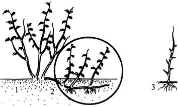 1.春季培土堆 2.枝条基部生根 3.第二年刨取生根苗