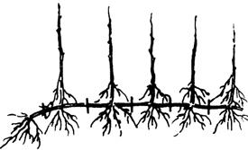 2.水平压条(图7-17) 一般在雨季(7~8月)进行。操作过程:选靠近地面距有较多分枝的2年生枝条,呈水平状横压于浅沟内,用枝杈等固定于沟底,然后覆土并使各分枝露出地面。翌年春将已生根的压条分段剪开,供嫁接或定植用。