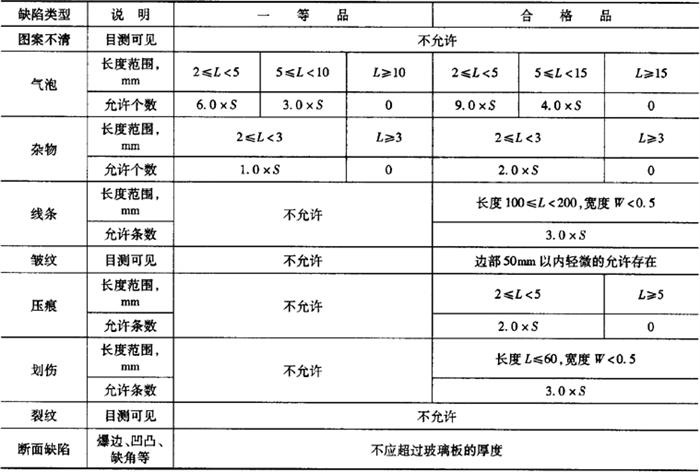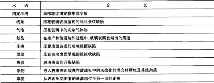 释义 | 压花玻璃 1.术语(表6-24) 表6-24 压花玻璃的相关术语 2.分类 1)压花玻璃按外观质量分为一等品、合格品。 2)压花玻璃按厚度分为3mm、4mm、5mm、6mm和8mm。 3.要求 1)压花玻璃应为长方形或正方形,其长度和宽度尺寸允许偏差应符合表6-25的规定。 表6-25 长度和宽度尺寸允许偏差mm 2)压花玻璃的厚度偏差应符合表6-26的规定。 表6-26 厚度允许偏差mm 3)压花玻璃对角线差应小于两对角线平均长度的0.2%。 4)压花玻璃的弯曲度不应超过0.3%。 5)压花玻璃外观质量应符合表6-27规定。 表6-27 压花玻璃外观质量 注:1.表中,L表示相应缺陷的长度,W表示其宽度,S是以平方米为单位的玻璃板的面积,气泡、杂物、压痕和划伤的数量允许上限值是以S乘以相应系数所得的数值,此数值应按GB/T 8170修约至整数; 2.对于2mm以下的气泡,在直径为100mm的圆内不允许超过8个; 3.破坏性的杂物不允许存在。 |