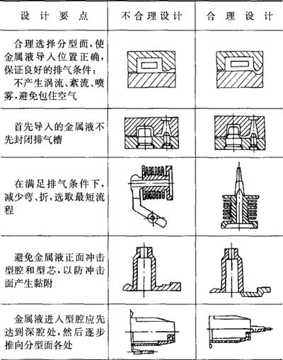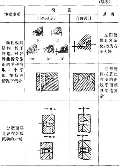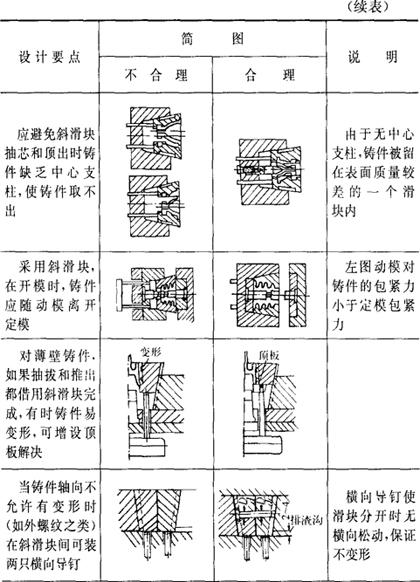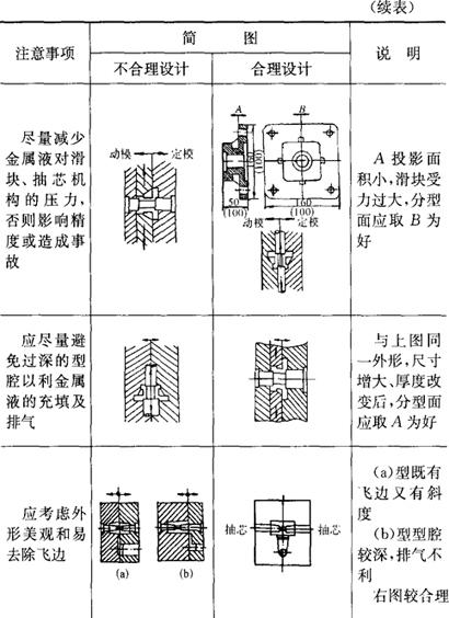 释义 | 压铸模设计要点 (一)分型面的选择 压铸模的动模和定模的接合面,称为分型面。选择分型面时的注意事项,见表3.3-2。 表3.3-2 选择分型面时的注意事项 (二)型腔的布置 型腔布置应考虑如下原则: ①型腔应尽可能设在机器的中心位置,使合模及压射时受力均衡。 ②型腔应留有开设排气道和集渣包的位置,特别是深、长的铸件更应如此。 ③型腔应考虑采用一模多铸的形式: (a)铸件小而简单,且生产批量大,可采用相同铸件一模多铸。 (b)铸件简单、生产批量不大,在一定条件下可采用几个不同的铸件布置在同一模具中,但应符合下述要求: ●铸件质量、壁厚相差不多(图3.3-3)。图(a)为合理,图(b)为不合理。 图3.3-3 ●铸件质量要求不高,且工艺规范相似。 ●尽量使模具温度均匀。 (三)浇注系统设计要点(表3.3-3) 表3.3-3 浇注系统设计要点 (四)排气槽设计要点(表3.3-4) 表3.3-4 排气槽设计要点 (五)镶块与芯子结构设计要点(表3.3-5) 表3.3-5 镶块与芯子结构设计要点 (六)压铸模外形尺寸的确定(表3.3-6) 表3.3-6 压铸模外形尺寸的确定 注:按型腔的深浅大小,可适当增减表内参数。 (七)抽芯机构设计要点 抽芯机构种类很多,现以最常用的斜滑块抽芯机构为例,说明其设计要点(表3.3-7)。 表3.3-7 斜滑块抽芯机构设计要点 (八)顶出机构设计要点 顶出机构种类很多,现以最常用的顶杆顶出机构为例,说明其设计要点(表3.3-8)。 表3.3-8 顶杆顶出机构设计要点 (九)模具的冷却(表3.3-9) 表3.3-9 模具的冷却 |