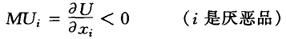 式中,xj(j=1,2,…,n,j≠i)是非厌恶品,xi>0是厌恶品,“>”表示强偏好关系,可以看出,厌恶品的边际效用小于零,即: