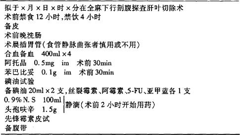 说明:(1)术前准备包括进一步确诊、肝功能各项或肝功能损害的分级测定,判断病人耐受力,估测术中切除肝肿块、肝叶的可能性和其他手术方式,术前进行营养支持,减少并发症。
