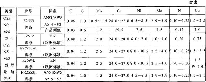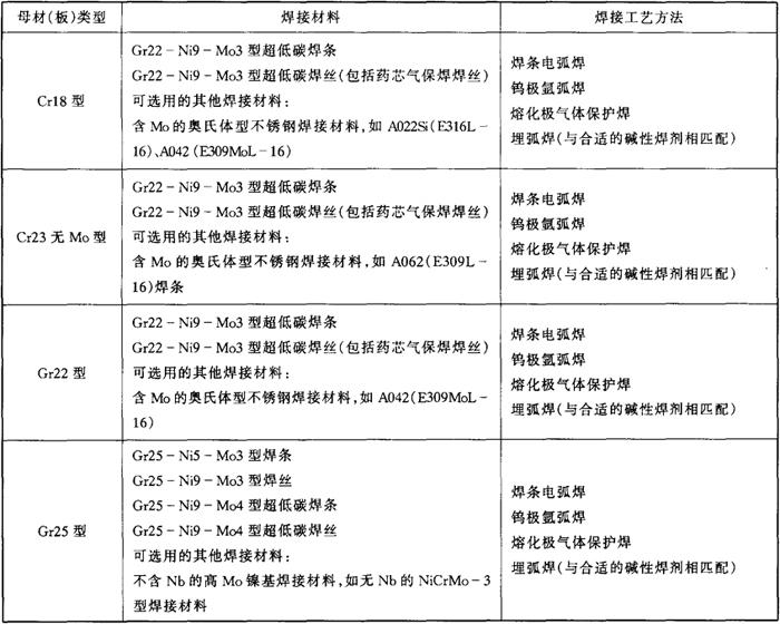 释义 | 双相不锈钢的配套焊接材料 双相不锈钢焊接的目标是使焊缝和热影响区(HAZ)的韧、塑性和耐蚀性与母材金属相同。由于焊接的特点,焊缝金属凝固和随后的冷却速度很快,焊缝采用与母材相同的化学成分时在高温形成单相的铁素体组织,来不及像母材那样在1050~1100℃保温并水淬处理,发生部分铁素体转变为奥氏体的过程。因此,对于焊后直接使用的双相不锈钢结构,其使用的焊接材料的化学成分与母材不同,镍含量要高于母材的镍含量,对双相钢2205和超级双相钢2507,如表2-13和表2-14所示相应的焊接材料的镍含量是8%~9%和9%~10%。提高了镍含量的焊材的焊缝在焊后状态即可形成20%以上的奥氏体(F≤80),使焊缝的综合性能可与母材性能匹配。 另一方面双相不锈钢的焊接结构,在焊后可进行固熔退火的,其焊接材料则可以采用与母材成分相同的焊材,因为在(1050~1100℃)固溶退火时焊缝中的铁素体将有部分转变为奥氏体,形成平衡的铁素体-奥氏体双相焊缝,达到与母材匹配的性能。但是焊后可进行1050~1100℃的固溶退火的机会很少,通常大部分结构是在焊态下使用,所以主要配套焊材为高Ni的材料。 表2-13中是几种典型双相不锈钢的匹配焊接材料牌号。表2-14为典型的双相不锈钢焊材化学成分。 表2-13 双相不锈钢的配套焊接材料 表2-14 典型焊接材料熔敷金属的化学成分(质量分数,%) 注:标准中的单值为最大值。 |
