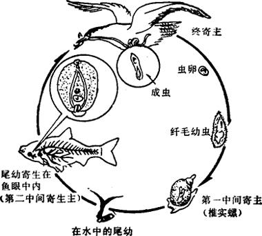 症状 发病有急性型和慢性型两种。急性型的病鱼,头部充血,在水中旋转、跳跃、挣扎,鱼体失去平衡,继而缓慢游动而死;慢性型可引起鱼类水晶体混浊,呈白内障症状,又称“白内障病”,严重时,水晶体脱落,鱼体发黑、消瘦、弯曲,造成鱼类死亡。其生活史见图4-19。