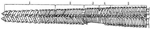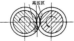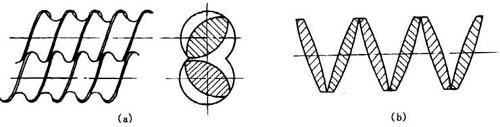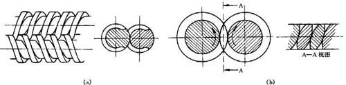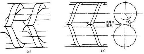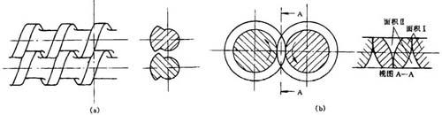 释义 | 双螺杆挤出机的类型 双螺杆挤出机的分类方法很多。 按两根螺杆轴线的几何角度可分为平行型双螺杆挤出机和锥型双螺杆挤出机。在平行型双螺杆挤出机中还可以分为紧密啮合式和非紧密啮合式。 按两根螺杆的相对旋转方向可分为:同向旋转和反向旋转两种。 (一)紧密啮合同向旋转(CICO)式平行双螺杆挤出机 紧密啮合双螺杆挤出机即螺棱外形与螺槽外形是紧密配合,是属于低速双螺杆挤出机。 CICO双螺杆的形状和啮合区的横截面积见图3-1。 图3-1 CICO双螺杆的几何形状和啮合区的横截面积 (a)几何形状 (b)啮合区的横截面积 如图3-1(a)所示,两根螺杆之间形成良好的密封;但从啮合区的横截面来看,两根螺杆的螺槽之间有较大间隙,如图3-1(b)。由此图可知,如果阻碍面积[图3-1(b)中的面积Ⅰ]比空隙面积[图3-1(b)中面积Ⅱ]大,则输送特性完全呈正向;如果空隙面积大于阻碍面积,则正向输送特性大为减弱。由于CICO双螺杆挤出机中空隙面积小于阻碍面积,所以,CICO挤出机有一定的正向输送特性。 如图3-2所示,物料进入啮合区将形成高压。 图3-2 啮合区进口处的高压区 压力增高的主要原因是:当物料进入啮合区时,流道横截面减小;并且流动方向的改变也使压力增高。这些高压将在螺杆上产生试图推开螺杆的侧向力(即分离力)。这种分离力将随螺杆转速的增大而提高。很明显,这种分离力不能大到使螺杆与料筒接触。因此,CICO挤出机必须低速运转。 (二)紧密自洁同向旋转(CSCO)式平行双螺杆挤出机 CSCO螺杆的几何形状和啮合区的横截面如图3-3所示。 图3-3 CSCO螺杆的几何形状和啮合区的横截面 (a)几何形状 (b)啮合区横截面 由图3-3可知,从一根螺槽到相邻螺槽有很大的空隙,所以,啮合区形成高峰压力值不大,因此,CSCO双螺杆挤出机可以高速旋转,转速可达600r/min。 (三)紧密啮合异向旋转(CICT)式平行双螺杆挤出机 CICT双螺杆的几何形状和啮合区的横截面见图3-4。 图3-4 CICT双螺杆的几何形状和啮合区的横截面 (a)几何形状 (b)啮合区的横截面 如图3-4(b)所示,CICT啮合区的横截面两螺杆螺槽之间的空隙相当小,因此,CICT挤出机可以实现较大正向输送特性。 啮合区的螺杆速度在同一方向,因此,进入啮合区的物料有流经啮合区的强烈趋势。如果两根螺杆间的间隙相当小,则通过啮合区的料流十分小,这将造成啮合进口处物料累积形成料垄;而吸入缝隙的物料使两根螺杆上产生很大的压力。这种压力可能引起螺杆弯曲,因此,CICT挤出机通常是低速运行。 (四)非啮合式反向旋转式(NOCT)式平行双螺杆挤出机 非啮合式双螺杆挤出机是两螺杆之间的中心距大于螺杆半径之和的双螺杆挤出机。非啮合式双螺杆挤出机商品化范例是反向旋转(NOCT)挤出机。NOCT双螺杆的几何形状和啮合区的横截面见图3-5。NOCT挤出机物料输送与单螺杆挤出机相似;而主要区别是物料从一根螺杆交换到另一根螺杆。如果顶峰面积为零[如图3-5(b)],则NOCT挤出机的挤出量恰如两台单螺杆挤出机。 图3-5 NOCT双螺杆的几何形状和啮合区的横截面 (a)几何形状 (b)啮合区的横截面 如果顶峰区的面积不为零,则NOCT挤出机的挤出量小于相同螺杆直径的单螺杆挤出机挤出量的两倍。 NOCT挤出机的正向输送特性小于单螺杆挤出机,因此,回混性优于单螺杆挤出机。所以,NOCT挤出机主要用于掺混、排气、化学反应等场合,NOCT挤出机不适合于型材的挤出。 不等长双螺杆挤出机是NOCT商品化挤出机又一范例,使得挤出机后段用单螺杆出料,如图3-6所示。 图3-6 不等长双螺杆挤出机 这种挤出机的优点有二:其一,改善了挤出特性;其二,仅一根螺杆有推力负荷,副螺杆(短螺杆)上的推力负荷很小。这种构型的挤出机的缺点是输送过程不对称。 (五)锥型双螺杆挤出机 锥型双螺杆挤出机中的螺杆如图3-7所示。 图3-7 锥形双螺杆挤出机螺杆及其分区 1-熔融区 2-排气区 3-压缩区 4-混合区 5-加料区 两根锥型螺杆在料筒中互相啮合、异向旋转,一根螺杆的螺棱顶部与另一根螺杆的根部有合理的间隙。由于异向旋转,一根螺杆上物料螺旋前进的道路被另一根螺杆堵死,物料只能在螺纹的推动下,通过各部分间隙轴向前进。当物料通过两根螺杆之间的径向间隙时,犹如通过两辊的辊隙,所受的搅拌和剪切十分强烈,因而,塑化均匀,特别适宜加工PVC塑料。 锥型双螺杆的压缩比不但由螺槽从深到浅而形成,同时,也由螺杆外径从大到小而形成,因而压缩比相当大,所以,物料在料筒中塑化得更充分、更均匀,保证了制品的质量。在此前提下,可以提高转速,从而提高挤出量。 锥型双螺杆的螺杆特性曲线比较硬,比较易于调整沿料筒轴向温度曲线的形状,以适应加工温度范围较窄的塑料需要。对于PVC,在加料段必须使加工温度低于粘流温度,而在以后各段又应有一个适当的温度梯度。锥型双螺杆则能够实现理想的调节作用。 |