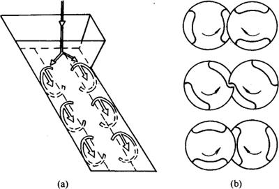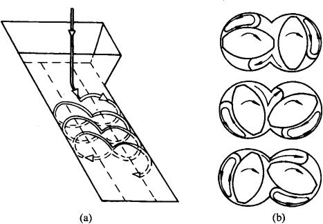 释义 | 双螺杆挤压机的工作特性 1.强制输送特性 从图3-6-10中可看出两根螺杆啮合状态和螺距逐渐变化的趋势。两轴之间以及轴与筒体之间都有一定的间隙,一根螺杆的螺旋齿顶插入另一根的螺槽内,两根螺杆相互啮合,螺杆转动时,随着啮合部分的轴向移动,在螺旋升角的作用下及啮合部分轴向的移动,物料不会产生倒流和停滞,这就是双螺杆挤压机固有的强制输送特性。而单螺杆挤压机中物料向前移动主要靠来自物料与筒体和螺杆间摩擦力,如果物料与筒体内壁的摩擦力小,物料将随着螺杆转动,螺纹便不能发挥推动物料前进的作用,物料将不向前输送。这就是双螺杆挤压机的优越性。 图3-6-10 双螺杆挤压机螺杆在机筒内的装配图 2.特有的自清洁性能 在双螺杆挤压机中的螺旋啮合处,齿顶与另一根螺旋的齿根存在着速度差(反向转动时),在转动过程中由于速度差的存在,因而能相互清除黏附在螺杆上的物料。在同向双螺杆中,啮合处的速度相反,相对速度更大,清除黏附在螺杆上的物料更有效,这就是它特有的自清洁性能。 3.同向转动和异向转动对物料混合的影响 从图3-6-11中可看出同向旋转双螺杆在啮合处的速度方向相反,一根螺杆把物料拉入啮合间隙,另一根螺杆把物料从间隙中推出,使物料从一根螺杆移动到另一根螺杆中,成“∞”形前进,有助于物料的混合和均化。从图(a)中看到这种物质在出料端沿圆周横截面上的流量不均匀。 图3-6-11 同向转动的啮合型双螺杆工作示意图 (a)物料纵向流动 (b)物料在螺旋中流动 从图3-6-12可看出异向转动啮合型双螺杆挤压机这种转动的螺旋啮合使连续的螺杆被围成相互隔离的C形小室。螺杆转动时C形小室沿着轴向移动,像螺杆泵一样把物料推向前进。从图3-6-12(a)中可看出,C形小室的物料封闭前进,两螺杆之间物料交换不多,所以这种运动在出料端沿圆周方向的流量比同向转动的情况要均匀些,但混合效果较差。 图3-6-12 异向转动啮合型双螺杆工作示意图 (a)物料纵向流动 (b)物料在螺旋中流动 |