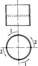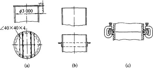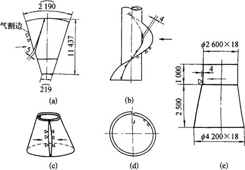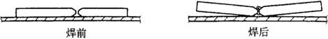 释义 | 受热变形与矫正 1.钢材受热变形的原因和防变形措施 人们都知道,钢材焊接后都要产生变形,其原因及防止措施概括如下。 (1)受热变形的原因 ①胀缩应力。焊接时,焊缝及热影响区受热而膨胀,但由于受到周围金属的阻碍而不能自由膨胀,此时产生压应力;冷却时,焊缝及热影响区要收缩,但又受到周围金属刚性的牵扯而不能自由收缩,而产生拉应力。由于以上所述两种应力的存在使焊件产生了变形。 ②金相组织的转变。焊接后,焊缝及热影响区的金属,由珠光体转变为奥氏体,在连续冷却时,奥氏体是在一温度范围内进行转变,因此往往得到混合式组织,如珠光体加索氏体,索氏体加屈氏体,屈氏体加马氏体等。随着温度的降低,转变产物的硬度随之提高,延伸率和断面收缩率也随之增大,因此产生了收缩,焊件发生变形。 (2)防变形措施 铆工在实际工作中,取得了许多丰富的经验,有效地防止了焊件的变形,概括起来大致有:反变形法、对称受热法、加大断面法、自由胀缩法、热量集中法和缩小温差法等。下面分别叙述之。 1)反变形法 将焊件向将要变形的反方向摆放或变形,焊接后与预先的反变形相抵消,而使焊件达到设计的平整度。 常用反变形的构件有组对H钢的翼板和对接板等,为了使读者有个基本的依据,下面列表8-2以供参考。这是因为,焊接后的变形量与很多因素有关,如材质、焊接方式、焊接电流大小、焊接速度、冷却速度、腹板和翼板的板厚比和设计要求的焊角高度等,故除参考此表外,还应选一试件试验后方可决定实际的变形量为最合适。 表8-2 手弧焊时的反变形值 (mm) ①胎具和方法:对于H钢翼板的反变形,如图8-65和图8-66所示,分别为在立式压力机和卧式压力机进行反变形的胎具和方法,下面仅以图8-65在立式压力机进行反变形为例讲述,卧式反变形从略。 图8-65 反变形板的立式压制胎具和方法 1-压力机底座;2-滑道;3-连接板;4-压紧螺栓;5-限位角钢;6-被压板料;7-压力机顶头;8-限变形量下垫板(t=6);9-样板;10-H钢 图8-66 反变形板的卧式压制胎具和方法 1-上胎;2-被变形板;3-下胎;4-托滚 ②反变形量的确定:除参考表8-2外,还应选一试件焊接后再确定,如本例,焊脚高度设计要求为12mm,焊三遍,查表反变形量为3.75mm,经埋弧自动焊试验后为6mm。应以试验数据为准。 ③样板的作法:如图8-65所示,样板宽度与翼板等宽,并中心线处切出一缺口,以检验所压的线是否在板的中心。 ④胎具的制作:用角钢5的目的,立面作为横向限位铁,平面作为压下量的限位铁,其厚度等于反变形量6mm;下胎板8与角钢5的平面配合使用起到限制压下量的作用。在吊车的配合下,随时用样板检查,适当调整压力机的压力便可得到设计的反变形程度。 ⑤对接板的搁置反变形:如图8-67所示,为对焊一底板采用反变形方法示意图,此法的关键是确定限位铁的厚度,可根据经验参考表8-2确定。 图8-67 对接板搁置反变形 2)对称受热法 任何形式的钢结构,焊接时要对称受热才能改善防变形效果。图8-68和图8-69所示为不对称受热引起变形的实例。图8-68为从一大板上切下的长条板,一边为原始边,一边为气割边,割后向气割边弯曲了30mm;图8-69为拼接法兰盘,由于焊工误操作不对称焊接而引起较大变形。根据这些经验,焊接一切结构时都应接受此经验行事。图8-70所示为圆筒体对称施焊防弯曲的方法;图8-71所示为贮罐底板由内向外对称分段退焊法防变形方法。 图8-68 气割不对称变形实例 图8-69 电焊不对称变形实例 图8-70 筒体对称施焊防弯曲 图8-71 贮罐底板对称退焊法防变形 3)加大断面法 人人皆知,厚板变形小,薄板变形大,这是什么原因呢?归根结底一句话就是刚性问题,厚板的断面大,所以刚性就大;薄板的断面小,所以刚性就小。 如图8-72所示,为冷加工加大断面防变形实例,从图中可看出,原始的板或筒体断面较小,经加工后断面增大,故加工后的刚性要比加工前的刚性大得多,使用时变形就小。 图8-72 冷加工加大断面防变形实例 (a)、(b)加大断面前后的板材;(c)加大断面前后的筒体 如图8-73所示,为热加工加大断面防变形实例,从图中可看出,原始的底板或筒体或法兰,其断面较小,经增加型钢或夹具后其断面加大,故后者比前者的刚性大,变形小。图8-74所示也是热加工加大断面防变形实例。 图8-73 热加工加大断面防变形实例 (a)加大断面前后罐底板;(b)加大断面前后筒体;(c)加大对焊法兰断面 图8-74 热加工加大断面防变形实例 (a)大型贮罐抗风圈;(b)焊接环缝用胀圈;(c)焊接纵缝用防变形板和引弧板 4)自由胀缩法 前面已经说过,构件产生变形的一个重要原因是不能自由胀缩而产生应力,根据这一原理,如果能使焊缝自由胀缩,便可防止变形。 如图8-75所示,图(a)为球罐壳体焊接顺序,图(b)为贮罐底板焊接顺序,皆应先纵后横。其原理是:将各瓜瓣(或中幅板)先焊为一环带(或长条),焊时因不受横缝限制,能自由胀缩,待相邻所有纵缝焊完全冷后,再焊其中间的横缝,又成了带与带(或长条与长条)之间的自由胀缩,故能达到防变形的目的。 图8-75 自由胀缩防变形实例 (a)球罐壳体先纵后横;(b)贮罐底板先纵后横 5)热量集中法 热量集中,一则加快了焊接速度,二则减小了热影响区,因而产生金相组织转变的区域减小,所以能减小变形。按热量集中程度由大到小可排列为:氩弧焊、埋弧自动焊、手工电弧焊和气焊。同样一个构件,用气焊变形大,用氩弧
