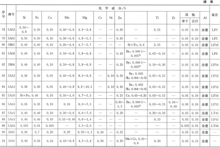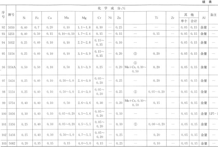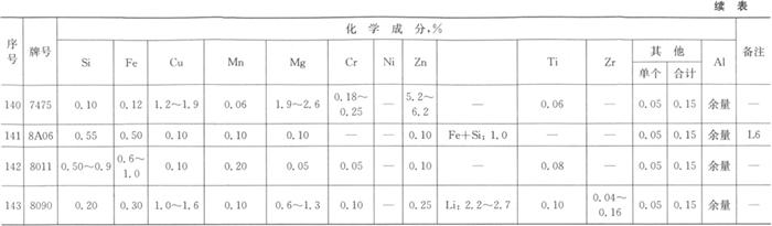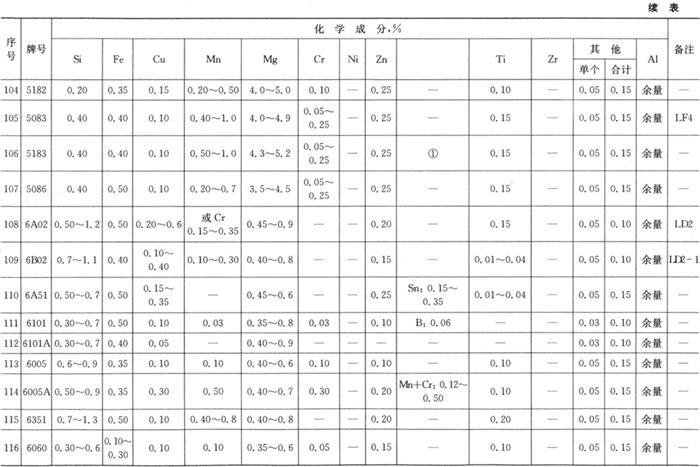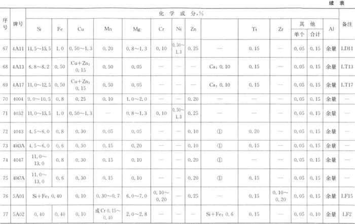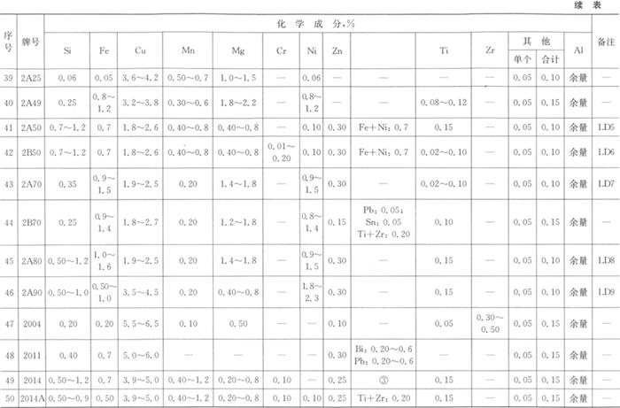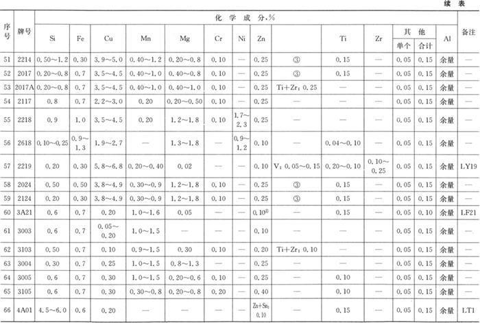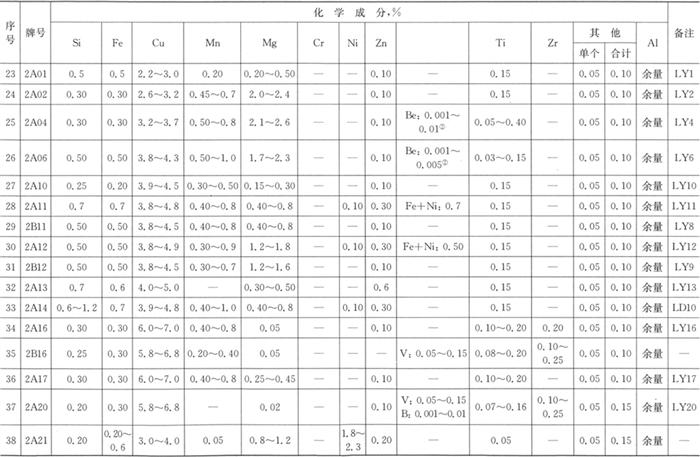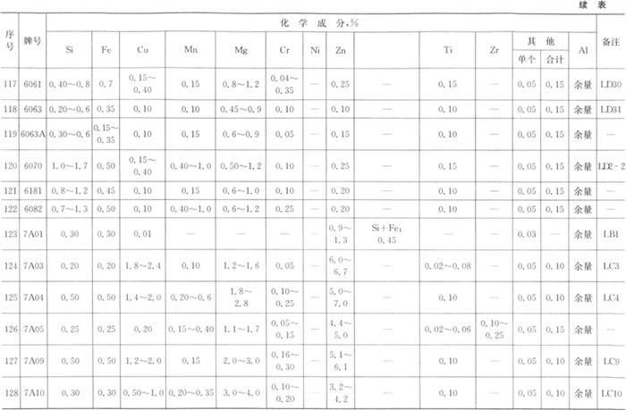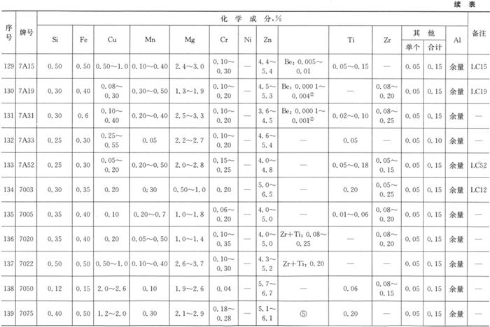 释义 | 变形铝合金的牌号及化学成分 按GB/T 16474-1996《变形铝及铝合金牌号表示方法》,凡是化学成分与变形铝合金国际牌号注册协议组织命名的合金相同的所有合金,其牌号直接采用国际四位数体系牌号,未与国际四位数字体系牌号接轨的,采用四位字符牌号。四位字符牌号的第一位、第三位,第四位为阿拉伯数字,第二位为英文大写字母。第一位数字表示铝合金组别,如2×××-Al-Cu系,3×××-Al-Mn系,4×××-Al-Si系,5×××-Al-Mg系,6×××-Al-Mg-Si系,7×××-Al-Zn系,8×××-Al-其他元素,9×××-Al-备用系。这样,我国变形铝合金的牌号表示法与国际上的通用方法基本一致。 表9.1-3列出了按GB/T 3190-1996标准制订的中国变形铝合金的化学成分,该表适用于以压力加工方法生产的铝及铝合金产品(板、带、箔、管、棒、型、线和锻件)及其所用的铸锻和板坯。表中,含量有上下限者为合金元素,含量为单个数值者为最高限。“其他”一栏系指未列入或未规定数值的金属元素。表头未列出的某些元素,当有极限含量要求时,其具体规定列于空白栏中。 表9.1-3 中国变形铝合金的化学成分(GB/T 3190-1996) 注:①用于电焊条和焊带、焊丝时,铍含量不大于0.0008%。 ②铍含量均按规定量加入,可不作分析。 ③仅在供需双方商定时,对挤压和锻造产品限定Ti+Zr含量不大于0.20%。 ④作铆钉线材的3A21合金的锌含量应不大于0.03%。 ⑤仅在供需双方商定时,对挤压和锻造产品限定Ti+Zr含量不大于0.25%。 |