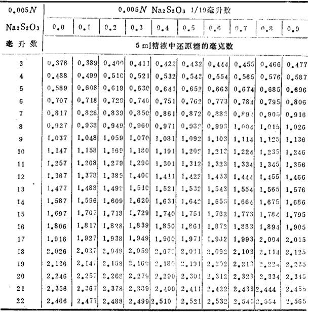 释义 | 可溶性糖的测定(索姆吉法测还原糖) (一)适用范围 本法为微量法,适测含糖较少的样本,如植株茎、叶等,要求在5ml浸提液中含糖0.3-2.5mg范围内。 (二)试剂配制 1.索姆吉试剂 将25g无水Na2CO3和25g酒石酸钾钠(KNaC4H4O6·4H2O)放入2L烧杯中,加水约500ml使溶解,不断搅拌,并将直立漏斗插入液面以下,从漏斗加入75ml10%CuSO4·5H2O溶液。再加入20gNaHCO3,使完全溶解后再加5gKI,然后移入1L容量瓶中,加入250ml0.100N KIO3,用水定容。用微孔玻璃漏斗过滤,放置过夜后备用。 2.KI-K2C2O4 溶解2.5gKI及2.5g草酸钾(K2C2O4)于100ml水中,每周现配现用。 3.0.005N Na2S2O3标准溶液:配法与斐林碘量法同,用时稀释。 4.70-80%乙醇溶液 95%乙醇70-80ml,用蒸馏水稀至95ml。 5.饱和氢氧化钡(约6%)。 6.5%硫酸锌。 7.2%盐酸 60毫升浓盐酸加水稀至1L。 8.饱和碳酸钠。 9.6N盐酸。 (三)测定步骤 称取相当于干样为0.5-1.5g的新鲜植株,在电动捣碎机中捣碎,将捣碎样与适量95%乙醇相混,使提取液最终乙醇浓度为70-80%(因鲜样含水,所以用95%乙醇)。如果用干样,则可称取0.5000-1.500g,直接加入约为样重50倍的70-80%乙醇溶液,置70℃水浴上提取30min,提取过程中要经常搅动。然后二者都按下列步骤测定:将已与70-80%乙醇溶液相混的样液,用已知重量的滤纸过滤,滤纸上残渣反复用70-80%乙醇溶液洗涤,对含有叶绿素的样品,应洗至无绿色为止。滤液与洗涤液合并可供测可溶性糖,残渣供测多糖(淀粉)。 将合并在一起的滤液与洗涤液,在水浴上加热以蒸去乙醇,当溶液呈黑色浆状时,边搅边加入饱和氢氧化钡溶液10-15ml。然后滴加5%硫酸锌溶液,以除去多余的钡盐。溶液中加二滴1%酚酞,再逐滴加入硫酸锌直至上层清液呈极淡红色为度。过滤并用蒸馏水洗净沉淀及滤纸,滤液及洗涤液收集于100ml容量瓶中,定容摇匀,即可供可溶性糖的测定。吸取15ml待测液于50ml容量瓶中,加6N盐酸2ml在25℃室温放置过夜或在70℃水浴上加热8min,使蔗糖转化为还原糖。转化结束后,加入甲基红指示剂二滴,用饱和碳酸钠中和至微黄色,定容摇匀。 吸取5ml(约含0.5-2.5mg还原糖)待测液放入25×200mm试管中,加5ml索姆吉试剂,摇动均匀。同时以5ml水代替糖液作空白标定试验。试管口盖以玻璃球或漏斗,在沸水浴中加热15min;小心将试管平稳地置于流动冷水浴中4min。然后去盖,沿管壁加入2mlKI-K2C2O4及3ml2N H2SO4(溶液为碱性时不要摇动),充分摇动混匀,使Cu2O完全溶解;再于冷水浴中放5min,并摇动2次。然后用0.005N Na2S2O3滴定,以淀粉为指示剂。由空白标定与样品测定所用的0.005N Na2S2O3毫升数之差,从表28-1查得相当的还原糖毫克数。用已知量的标准糖溶液同样进行测定,可以校验表28-1上的数值。 表28-1 索姆吉法还原糖——Na2S2O3当量 (四)结果计算 以此净耗0.005N Na2S2O3的毫升数查表28-1即得还原糖的毫克数。 (五)注释 ①用乙醇提取后的样液过滤时如不做碳水化合物系统分析(即不必求知残渣重),则用一般滤纸即可。 ②滤液加热蒸去乙醇后加入饱和氢氧化钡,是为沉淀样品中蛋白质、单宁、色素、胶体等物质。加入硫酸锌是消除多余的钡盐。如剩少量钡盐未除净时,对分析影响不大。 |