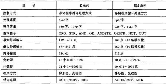 释义 | 可编程控制器(PC) 1.结构特点 (1)可编程控制器是以微机处理技术为核心的工业控制器,应用于自动化生产线控制系统,具有体积小,质量轻,容量大,可靠性高及编程简单等特点,由于采用模块结构,扩展功能很强,主要功能有:①顺序控制功能;②逻辑运算、定时、计数功能;③数学运算,数据处理功能;④过程控制和监视功能;⑤通讯联网功能;⑥自诊断和自动报警功能;⑦扩展功能。 (2)主要部件包括:①电源模块;②中央处理单元;③智能输入输出模块;④通讯模块;⑤输入输出模块。 2.主要产品及技术参数 (1)德国SIMATIC S5系列产品及技术参数: ①SIMATIC S5系列产品:S5-90U与S5-95U可编程控制器。这两种密集型小型控制器,适用于小规模控制,其经济适用,必要时可以扩展。 S5-100U可编程控制器:S5-100U是采用模块化结构设计的小型控制器,根据需要选用三种CPU模块,完成不同形式的扩展功能,如闭环调节,位置控制,计数和通讯等。 S5-115U可编程控制器:S5-115U可完成中等规模控制,有5种CPU模块供选择,可适用各种不同功能的控制目的。 S5-135U和S5-155U可编程控制器:这两种可编程控制器属多通道中档和高档次的控制器,几个CPU可执行不同的工作任务,完成复杂的控制和监控功能,可与上位机联用组成网络系统。 适用于S5系列的编程器:PG系列编程器分轻便型编程器、增强型编程器和通用型编程器。工作站型编程器PG770可作为设计、规划、工程诊断、工业控制的工作站使用。 ②S5系列产品技术参数:SIMATIC S5系列可编程控制器主要技术参数见表9-11-1。 表9-11-1 S5系列可编程控制器主要技术参数 (2)日本OMROIV公司C系列产品及技术参数: ①C系列产品。C系列产品分模块式、箱式、板式结构,适宜于中小规模控制系统。可根据控制规模和特点,选用不同形式的主机箱、扩展机箱及不同功能的CPU的扩展板,该产品价格低、体积小、安装方便,但扩展功能不如SIMATICS5产品。 ②C系列产品主要技术参数见表9-11-2。 表9-11-2 C系列产品主要技术参数 (3)日立公司E系列及EM系列可编程控制器:E系列及EM系列产品主要技术参数见表9-11-3。 表9-11-3 E系列及EM系列产品主要技术参数 |