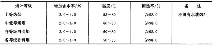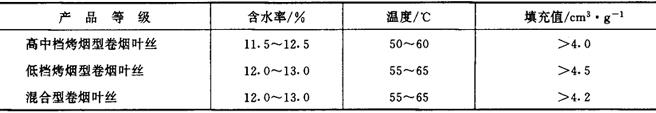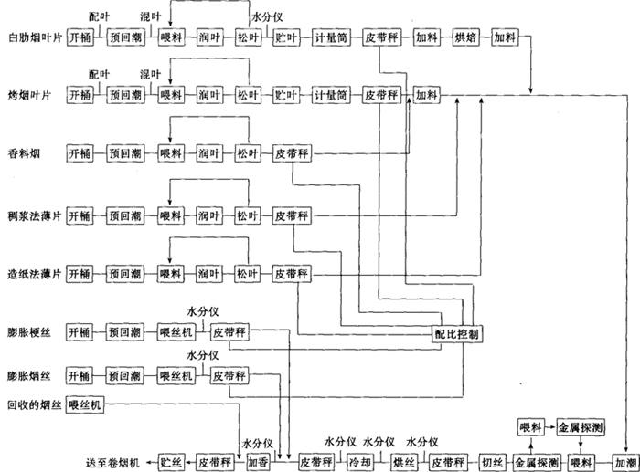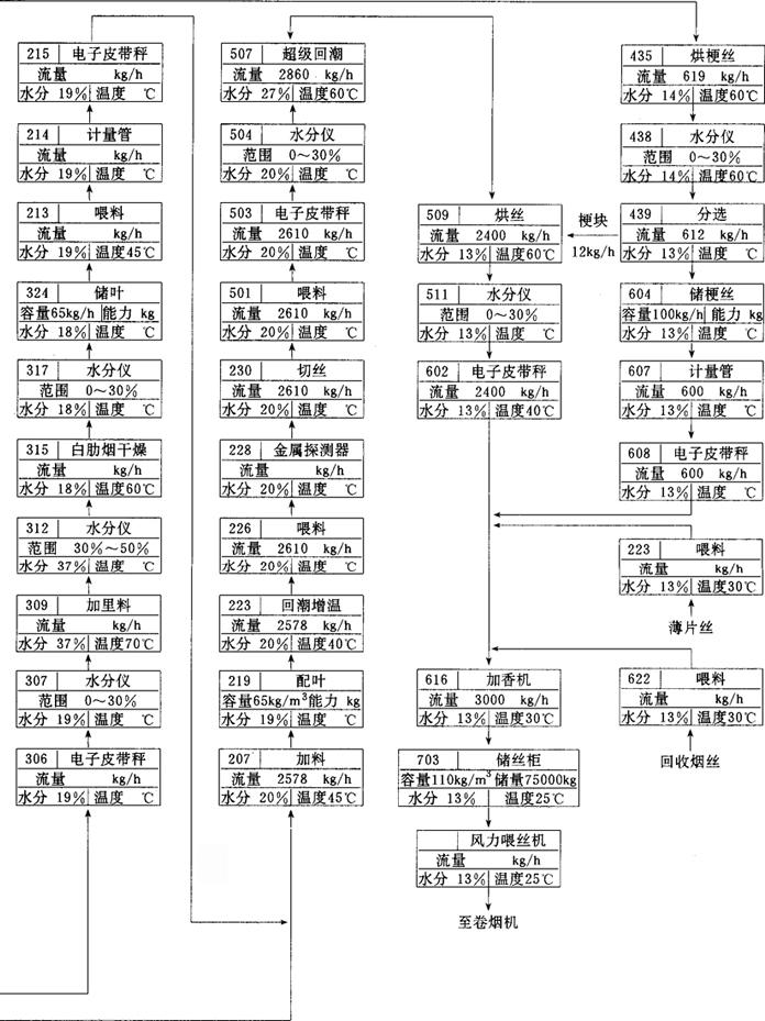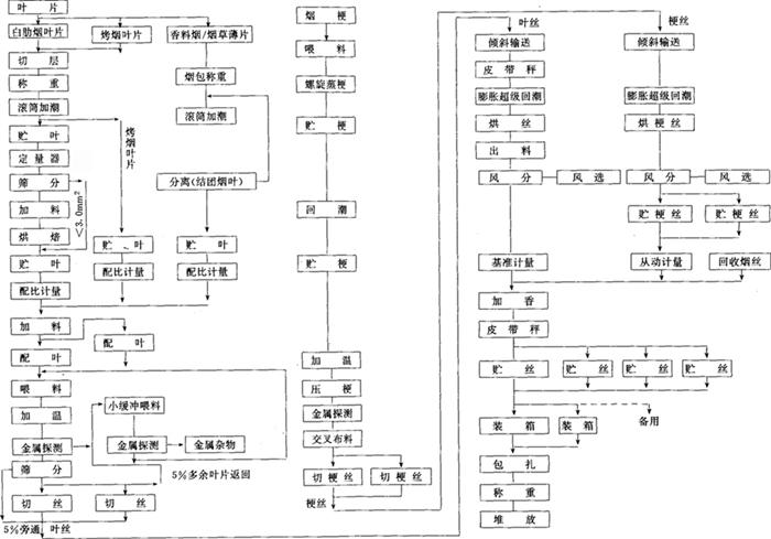 释义 | 各工序的加工工艺 (一)备料工序 1.工艺任务 按照产品的叶组配方准备烟叶原料,确保投入的烟叶原料在质量和数量上符合叶组配方要求;并按照核定的流程工艺制造能力,将原料分成批次,进行初步掺配。 2.来料要求 (1)烟叶原料的生产地区、类型、等级、质量和数量均应符合产品叶组配方规定。不得使用霉变、污染和虫蛀而未经处理的烟叶。来料烟叶均按12%的含水率折算成为标准质量。 (2)烟叶原料按批次有序堆放,每批之间间隔距离一般不小于1.0m,不得错堆、混堆及超高堆放。 3.技术条件 (1)烟叶原料周转场地应保持清洁,无杂物,远离污染源; (2)来料计量与记录准确,仓库来料应附有注明产地、类型、等级、年份、烤别、醇化方式、数量等简要说明的送料单。 (二)真空回潮工序 1.工艺任务 增加烟叶原料的含水率和温度,提高烟叶的抗破碎能力。 2.质量指标 (1)真空回潮后的烟叶应符合表7-4-2的要求。 表7-4-2 真空回潮后质量指标 (2)回潮后的烟叶质量不得降低。 3.加工方法、技术条件、设备性能要求及技术要点 见本篇第一章三之(三)。若来料包装材料含有塑料袋或牛皮纸包装层,则应先拆包(箱)后回潮。 (三)切尖解把、润叶、打叶、筛分工序 见本篇第一章三之(五)、(六)、(七)、(八)。 (四)整包叶片切块与滚筒回潮工序 1.工艺任务 将开箱解包后的叶片垂直或水平地分切成烟块,并将切下的烟块喂入回潮滚筒,一次性的回潮叶片,使其达到工艺所要求的含水率,以取代真空回潮及其后续的润叶工序(请参见图7-3-4)。 图7-3-4 GARBUIO(Quester)卷烟制丝工艺流程图 2.质量指标 烟叶经滚筒回潮加温加湿后,含水率为16%~18%,温度为50~60℃,叶片完全松散。 3.加工方法 解包去皮后的整包烟叶经输送提升至分切位置后,由切割设备按预先设定的质量分切成烟块,定量喂入回潮滚筒内,靠喷饱和蒸汽、喷水雾和热风循环来完成烟叶回潮任务。 4.技术条件 (1)来料是经过打叶去梗的片烟烟包,片烟质量符合产品叶组配方要求,平均含水率一般为11.0%~12.0%。 (2)汽压、水压及气压稳定。供汽压力约为0.7MPa,供水压力约为0.3MPa(硬度6.43mmol/L),压缩空气压力为0.6MPa。 (3)解包去皮后的烟叶经分切成烟块后,烟块质量均匀,进入回潮滚筒的烟块流量稳定,不超过设备的工艺制造能力。 (4)回潮滚筒内的循环热风温度调节范围一般为60~120℃。滚筒倾斜度一般为3°,滚筒转速调节范围一般为6~18r/min。 5.设备性能要求 (1)要求输送、提升、计量、分切及推进等设备运行平稳,分切的烟块质量可以调整,流量均匀稳定。 (2)回潮滚筒的筒体倾斜度及转速可以调整;循环热风温度、热风风速、喷雾量及喷汽量可以灵活控制。 (3)物料流量、汽压、水压、气压、循环热风温度等计量检测仪表精度符合要求,显示准确。设备可以手动操作,亦可自动操作。 (五)加料润叶工序 1.工艺任务 根据产品设计要求,将调配的料液准确均匀地施加到叶面上;提高叶片温度与含水率,使叶片迅速吸收料液,以改善烟叶品质。 2.质量指标 (1)配制料液精度误差应小于2.0%。施加到叶片上的料液量符合产品设计的用量比例要求。 (2)加料润叶后叶片温度一般为40~60℃,其含水率,高档卷烟的在制品为17%~20%,中低档卷烟在制品为18%~21%,混合型卷烟在制品为18%~24%。符合切丝要求。 3.加工方法 采用滚筒式加料润叶机,利用喷汽润叶,提高叶片温度与含水率,并根据叶片流量,按比例控制料液施加量。 4.技术条件 (1)来料流量稳定均匀,且不超过设备工艺制造能力;叶片松散,没有粘连结块现象。 (2)供汽压力为0.6~0.8MPa;料液严格按规定配制,预热后温度恒定(不同的料液预热温度一般在45~80℃范围内)。料液中无杂质与沉淀。 5.设备性能要求 (1)滚筒转速可以调节;放汽量可以调整,并且稳定,料液喷嘴喷射角度与排风系统的风量也可以调整。料罐(料筒)具有搅拌、过滤和温度控制功能。 (2)蒸汽压力、料液温度、料液流量及叶片流量等检测仪表与计量设备精度符合要求,显示准确可靠。可根据叶片流量调节料液流量。 (3)设备可手动操作,也可自动操作。 6.技术要点 加料后叶片含水率与温度的高低,取决于料液施加量、放汽量及排气量。料液流量与叶片流量应达到规定比例,喷施料液应对准烟叶流。 (六)配叶贮叶工序 见本篇第一章三之(九)。 (七)回潮加温工序 该工序术语不尽一致,“加温”、“加潮”均为同一工序。 1.工艺任务 增加烟叶温度与含水率(或补充贮叶过程中叶片散失的热量和水分),提高叶片的抗破碎性能。 2.质量指标 回潮加温后叶片温度为40~45℃;其含水率高中档烤烟型卷烟用料为18%~20%,混合型及低档烤烟型卷烟用料为20%~22%。 3.加工方法、技术条件、设备性能要求及技术要点 见本篇第一章三之(六)。 (八)切叶丝工序 1.工艺任务 将叶片切成规定宽度的叶丝。 2.质量指标 切丝宽度一般为0.7~1.1mm,叶丝合格率应大于99.0%。 3.加工方法 采用滚刀式切丝机或旋转式切丝机,将叶片定量喂入填料装置内,经上下铜排链压实、传送至刀门切成叶丝。 4.技术条件 叶片中无金属、石块等杂物;叶片温度为40~45℃,含水率为18%~22%;铺叶厚度一致,流量均匀,符合设备的工艺制造能力。 5.设备性能要求 (1)切丝宽度可以调整,切后叶丝宽度尺寸偏差应小于0.1mm。刀辊转速,刀门高度、刀门压力及铜排链传送速度均调节方便,刀片与刀门之间的间隙调节方便。刀片