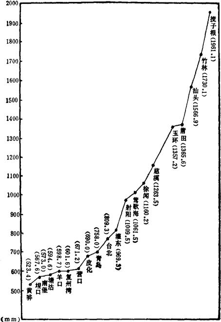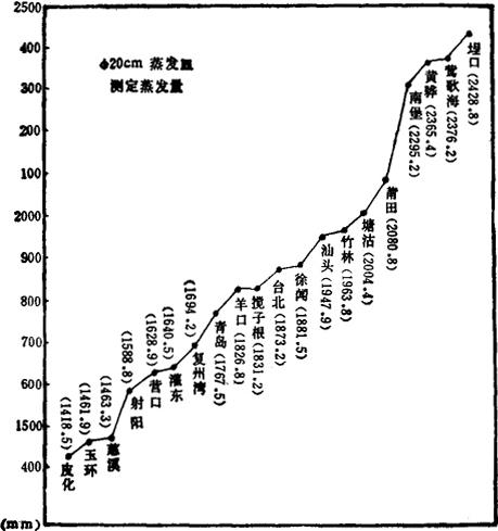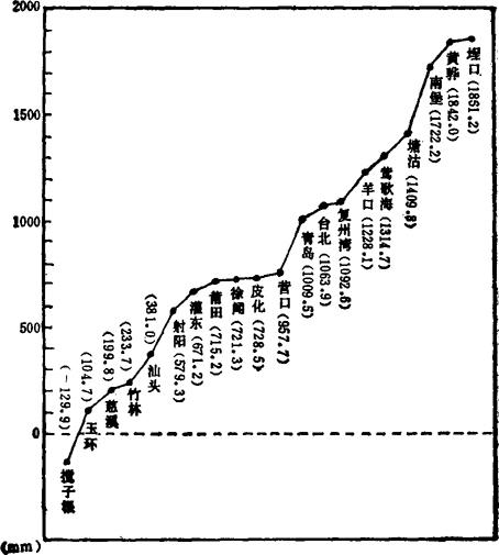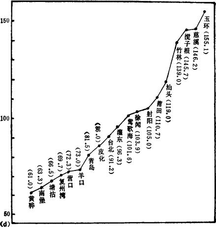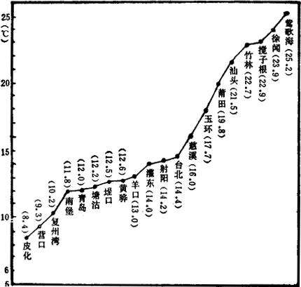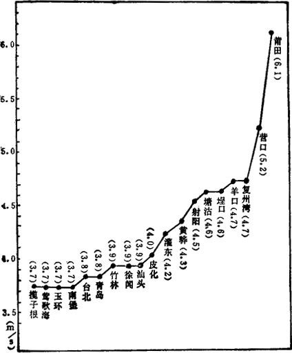 根据第四节中各盐场气象记录中历年统计平均结果,各主要气象因素的差别情况比较如图2-3-7至2-3-13。