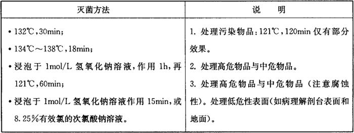 释义 | 各类污物的消毒处理 一、感染性废弃物的消毒处理 (一)液体污物 主要指患者吃过的剩饭剩菜、排泄物、分泌物、呕吐物等。 1.可作动物饲料的剩饭剩菜,须煮沸30min后才能运出。 2.无利用价值的剩饭剩菜和排泄物、呕吐物,加1/5量的漂白粉,搅匀后作用2h,倒入专用化粪池或运出。 3.特殊传染病病人的排泄物、呕吐物的消毒按下述(三)的方法处理。 (二)固体污物 1.无利用价值的可燃性污物,在条件允许的情况下可采用焚烧处理。 2.非可燃性固体污物应先消毒,然后根据物品的再利用价值,送废旧物品收购站或城市垃圾处理站。消毒方法可选用含有效氯或有效溴500mg/L~1000mg/L的消毒液、含1000mg/L~2000mg/L二氧化氯的消毒液或0.5%过氧乙酸消毒液浸泡60min。 (三)感染症病人污物的消毒处理 1.病人的粪便加两倍量10%~20%漂白粉乳液,呕吐物加1/5量干漂白粉,搅匀后加盖,作用2h,再倒入厕所。 2.伤寒病人的尿液每100mL加漂白粉3g,搅匀后加盖,作用2h。 3.患者使用过的便器用1%漂白粉上清液、含有效氯2000mg/L的消毒液、0.5%过氧乙酸浸泡30min。 4.病毒性肝炎病人衣物可用具有消毒杀菌作用的洗涤剂进行浸泡清洗;也可采用甲醛、环氧乙烷熏蒸消毒。 5.结核病人的痰盒收集后焚烧;也可加等量10%~20%漂白粉乳液(或1/5量的干粉),作用2~4h,或加等量1%过氧乙酸作用30~60min。 6.真菌病人用过的毛巾、衣物等可用含0.2%过氧乙酸浸泡30min后清洗;也可用上述4的熏蒸方法。 7.无经济价值的可燃性污物采用焚烧处理。 (四)炭疽病人污物的消毒处理 1.尽可能都采用焚烧处理。不能焚烧的,用含有效氯或有效溴2000mg/L的消毒液,或2%戊二醛浸泡,擦拭30~60min。 2.肠炭疽病人排泄物按上述(三)1.消毒处理,但作用时间需延长至6h;病人所用便器按(三)3.处理,但使用药物浓度应加倍。 (五)艾滋病病人污物的消毒处理 1.无经济价值的可燃性污物采用焚烧处理。 2.病毒携带者和病人分泌物、排泄物用20%漂白粉乳液1∶2混合后作用2h。 3.液体污物可煮沸30min,也可加入含氯消毒剂(使混合液中有效氯达到1000mg/L)或过氧乙酸(使混合液中有效氯达到5000mg/L),作用30min。 4.病人用过的衣物、床单等可装入防水口袋内,外加一布袋后采用压力蒸气消毒,也可直接煮沸30min。对被血液或排泄物明显污染的衣物,采用含有效氯1000mg/L的消毒液浸泡30min处理。 (六)朊毒污染物的处理 朊毒类感染因子对理化消毒及灭菌因子的抵抗力很强,消毒及灭菌处理困难。对该病患者或疑似患者用过的手术器械、物品及其分泌物、排泄物等可参照下表方法进行。 朊毒灭菌方法 二、一次性使用注射器、输液器、输血器等使用后的处理 1.使用过的一次性使用注射器、输液器和输血器等物品必须就地进行消毒毁形,并由当地行政部门指定的单位定点回收,集中处理,严禁出售给其他非指定单位或随意丢弃。 2.一次性使用输血器(袋)、采血后的一次性使用注射器可放入专用收集袋直接焚烧;不能采用焚烧方法的,必须先用含有效氯2000mg/L的消毒液浸泡60min(空针管芯应抽出)后,方可毁形处理。 3.一次性使用输液器使用后先剪下针头部分,用含有效氯或有效溴1000mg/L的消毒液浸泡60min以上,放入专用的收集袋即可。 4.使用后的一次性注射器建议使用毁形器进行毁形,然后用含有效氯1000mg/L的消毒液浸泡60min以上,即可回收;没有接触人体的一次性使用注射器毁形后即可回收。 5.明确没有污染的一次性使用医疗用品,如输液袋(瓶)、配制药物的空针等,使用后不需浸泡消毒,只要毁形后即可回收。 6.医院消毒供应科负责回收工作。各科室使用后加强管理,严防人为流失。凡参与一次性医疗用品处理的人员必须经培训合格并加强个人防护。 三、放射性废弃物的处理 1.存放要求 盛放固体废弃物的容器应在里面衬以耐用的透明塑料袋,可以用胶带或加热密封。液态废弃物应根据废弃物的化学和放射性质、体积、处理和贮存方法来选择合适的容器。衰竭的放射源应保存在防护层下。 2.放射性废液 (1)使用放射性核素量比较大、产生污水比较多的核医学单位,必须有废水专用处理装置或分隔污水池,以存放和排放废水。 (2)产生放射性核素废液而无废水池的单位,应将废液注入容器存放10个半衰期后,排入下水道系统。如废液含长半衰期核素,可先固化,然后按固体放射性废物进行处理。 (3)放射性浓度不超过1×104Bq/L的废闪烁液,或仅含有浓度不超过1×105Bq/L的3H或14C的废闪烁液,可按一般废弃物进行处理。 (4)对使用放射性药物进行治疗的病人的排泄物应实施统一收集和处理。对专用化粪池内的排泄物应贮存10个半衰期后排入下水道系统;对无专用化粪池的单位,应为病人提供具有辐射防护性能的尿液、粪便收集器,最初几天的收集物存放10个半衰期后作一般废弃物处理;对收集含有131I病人排泄物时,必须同时加入NaOH或10%KI溶液后密封存放待处理。 (5)对同时含有病原微生物的病人排泄物,应备有专用容器单独收集,经存放衰变、消毒处理后,排入下水道系统。 3.放射性固体废物 (1)废物袋、废物包、废物桶及其他存放废物的容器必须在显着位置标有废物类型、核素种类、比活度范围和存放日期的说明。 (2)内装注射器及碎玻璃等物品的废物袋应附加外套。 (3)焚化可燃性固体废物必须在具备焚烧放射性条件的焚化炉内进行。 (4)同时污染有病原微生物的固体废物,必须先消