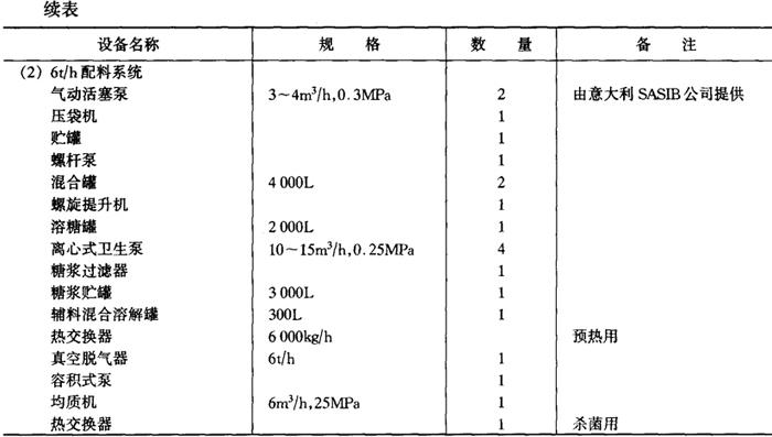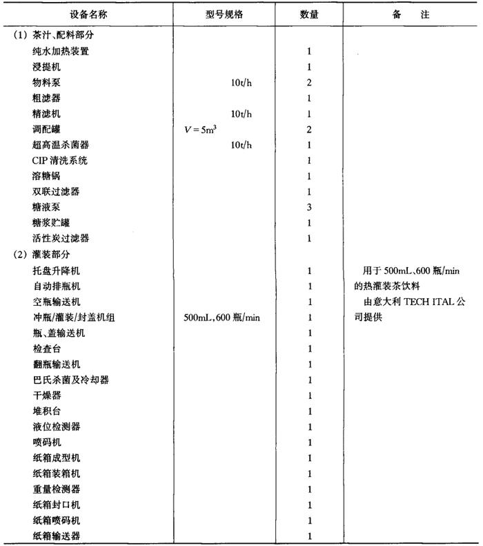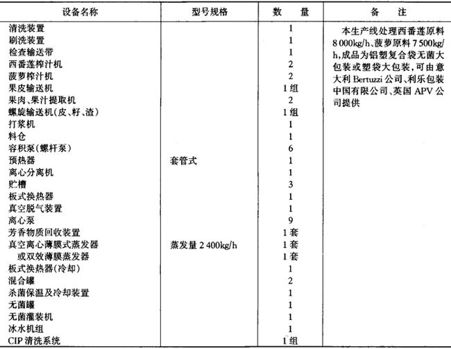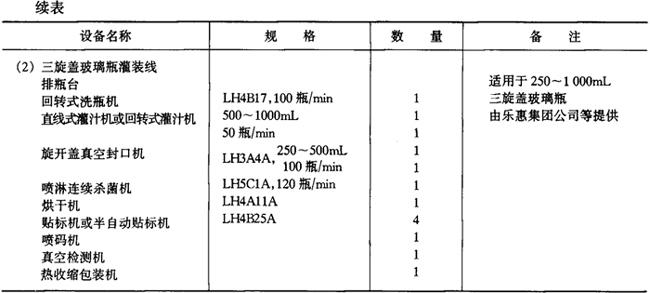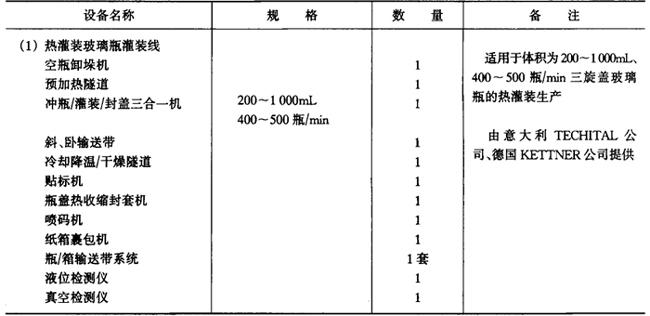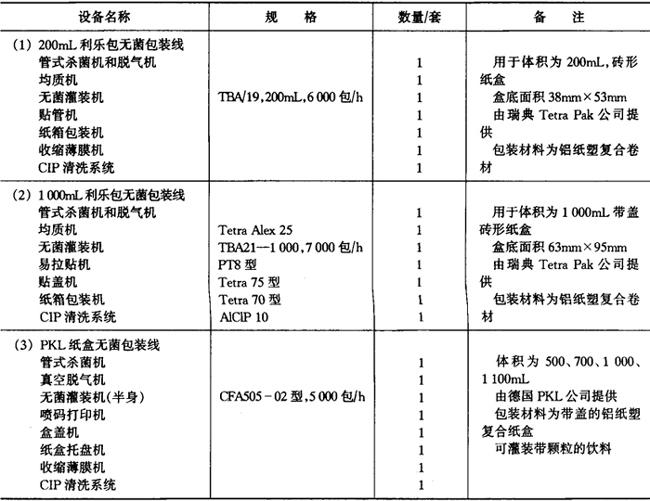 释义 | 各类饮料生产线 (一)概述 饮料的生产线因品种、加工方法、包装容器而异,由包装容器来分类的灌装线具有通用性。按包装容器对灌装线进行分类,有PET瓶、玻璃瓶两用灌装线、两片易拉罐灌装线、三片罐灌装线、铝塑纸复合砖形盒无菌包装线、铝塑纸复合屋脊包灌装线,铝塑复合大袋无菌灌装线、塑杯无菌包装线等。 1.PET瓶、玻璃瓶两用灌装线,两片罐、三片罐灌装线 制造厂目前国内有广东轻工业机械集团有限公司、南京轻工业机械集团公司、合肥轻工业机械厂等。这些工厂提供的灌装线,二片罐、三片罐线最高速度为600罐/min,玻璃瓶线最高速度为600瓶/min,PET瓶线最高速度600mL为200瓶/min,1.25L为120瓶/min,均属中等速度的灌装能力。其他饮料瓶灌装线厂家还有廊坊包装设备制造总公司、山东安丘轻工业机械厂、江苏白熊机械集团公司等,罐装生产线厂家有乐惠集团实业有限公司、汕头新湖罐头机械厂等,设备生产能力为中小规模。高速灌装线尚不能提供,仍依赖进口。 目前国外此类灌装线的生产厂家主要为德国KHS公司、KRONES公司、KETrNER公司;意大利的SASIB公司、TECHITAL公司、BC公司;美国迈耶(MEYER)公司等。这些公司的设备有以下特点: ①空PET瓶采用气力输送,适用于高速生产,减少倒瓶,大大提高效率。 ②采用常温灌装技术,灌装温度从4℃提高至20℃。 ③采用定量灌装技术,使定量更为准确。 ④冲瓶机、灌装机、封盖机三位一体,并采用星轮传输,提高了瓶子运行的稳定性,大大减少从冲瓶到灌装、灌装到封盖的距离,减少污染,提高质量。 ⑤自动化程度高,整条生产线都采用PLC电路控制。 2.铝塑纸复合砖形盒无菌包装线 目前国内尚在开发阶段,现有装备均为国际着名公司提供,最大供应商为瑞典Tetra Pak公司,其次为德国PKL公司及美国International Paper公司。铝塑纸复合屋脊包灌装线上海轻工业机械厂已能提供产品,国外供应商为瑞典Tetra-Pak公司及美国International Paper公司。 3.铝塑复合大袋无菌灌装线 国内已由航天航空部工艺研究所及沈阳自动化仪表研究所开发并应用,并引进有国际着名的食品机械商如意大利FBR-ELPO公司、BERTUZZI公司、MANZINI公司、瑞典Tetra-Pak公司、美国FMC公司等的产品。 4.二氧化碳净化系统 目前普遍使用上海饮料机械厂产品。 5.溶糖系统一般均在国内自行配置,但自动溶糖系统尚需引进,系采用英国APV公司的产品。 6.PET瓶制造线 国内尚无厂商提供,无论一步法、二步法均需从国外引进,但国内由瓶坯吹瓶的吹瓶机已有定型产品,只是产量低。 (二)碳酸饮料生产线 1.PET瓶灌装线 PET瓶灌装线主要设备见表6—4-8。 表6-4-8 碳酸饮料PET瓶灌装线主要设备(1.25L,250瓶/min) 2.二片罐灌装线 二片罐灌装线主要设备见表6-4-9。 表6-4-9 二片罐灌装线主要设备(355mL,1500罐/min) 3.玻璃瓶灌装线 玻璃瓶灌装线主要设备见表6-4-10。 表6-4-10 碳酸饮料玻璃瓶灌装线主要设备(250mL,500~600瓶/min) 注:(1)饮料瓶回收,重复使用 (2)整条生产线由南京轻工业机械集团、广东轻工机械集团有限公司等提供 4.糖浆系统 糖浆系统主要设备见表6-4-11。 表6-4-11 糖浆系统主要设备(热溶法) 5.二氧化碳净化系统 二氧化碳净化系统主要设备见表6—4-12。 表6-4-12 二氧化碳净化系统主要设备 (三)果蔬汁饮料、植物蛋白饮料生产线 1.无菌砖形纸盒灌装线 无菌砖形纸盒灌装线主要设备见表6-4-13。 表6-4-13 无菌砖形纸盒灌装线主要设备 2.玻璃瓶灌装线 玻璃瓶灌装线主要设备见表6-4-14。 表6-4-14 玻璃瓶灌装线主要设备 3.三片罐灌装线 三片罐灌装线主要设备见表6-4-15。 表6-4-15 三片罐灌装线主要设备 4.果汁调配系统 果汁调配系统主要设备见表6-4-16。 表6-4-16 果汁调配系统主要设备 5.豆奶生产线 豆奶生产线主要设备见表6-4-17。 表6-4-17 豆奶生产线主要设备 (四)浓缩果蔬汁和果蔬浆生产线 浓缩果蔬汁和蔬菜浆的生产线型式较多,目前国内各饮料厂的设备大都来自国际着名的英国APV公司、瑞士UNIPEKTIN公司、BUCHER公司、瑞典Tetra-Pak公司(利乐包装中国有限公司)、意大利BERTUZZI公司、MACHINE公司及美国FMC公司等。近年来国内开发较好的有沈阳发动机设计研究所(606所)、上海前卫机械厂、乐惠集团航空航天部625工艺研究所等。 主要果蔬汁生产线设备如下。 1.浓缩菠萝汁、西番莲汁生产线 浓缩菠萝汁、西番莲汁生产线主要设备见表6-4-18。 表6-4-18 浓缩菠萝汁、西番莲汁生产线主要设备 2.浓缩柑橘汁生产线 浓缩柑橘汁生产线主要设备见表6-4-19。 表6-4-19 浓缩柑橘汁生产线主要设备 3.浓缩苹果汁生产线 浓缩苹果汁生产线主要设备见表6-4-20。 表6-4-20 浓缩苹果汁生产线主要设备 4.芒果浆生产线 芒果浆生产线主要设备见表6-4-21。 表6-4-21 芒果浆生产线主要设备 5.山楂浆生产线 山楂浆生产线主要设备见表6-4-22。 表6-4-22 山楂浆生产线主要设备 6.番茄酱生产线 番茄酱生产线主要设备见表6-4-23。 表6-4-23 番茄酱生产线主要设备 (五)茶饮料 茶饮料生产由茶汁、配料及灌装两大部分组成。茶汁、配料包括热水系统、茶萃取系统、过滤系统、溶糖系统、调配系统及UHT杀菌系统。灌装部分由容器输送系统、茶饮料热灌装及保温冷却系统、贴标、喷码、装箱系统和检测系统。 PET瓶包装的茶饮料生产线设备见表6-4-24,三片罐及玻璃瓶生产可参照表6-4-15和表6-4-14。 表6-4-24 茶饮料生产线主要设备 (六)天然