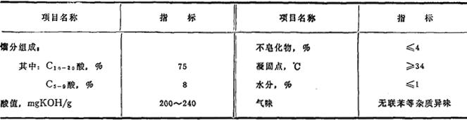 性能 常温下为白色或微黄色猪脂状固体,微有脂肪酸的特殊气味。不溶于水,溶于有机溶剂。相对密度0.87(80℃)。具有有机酸的通性。