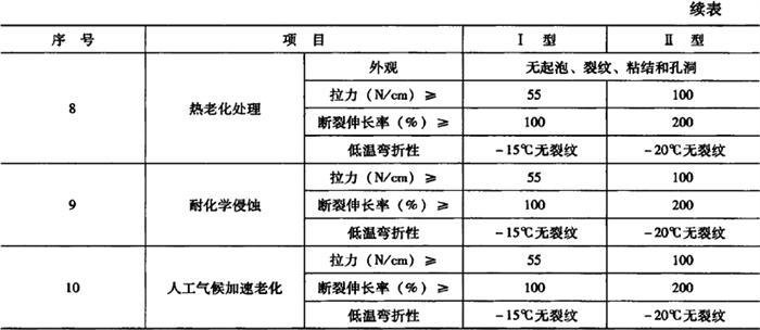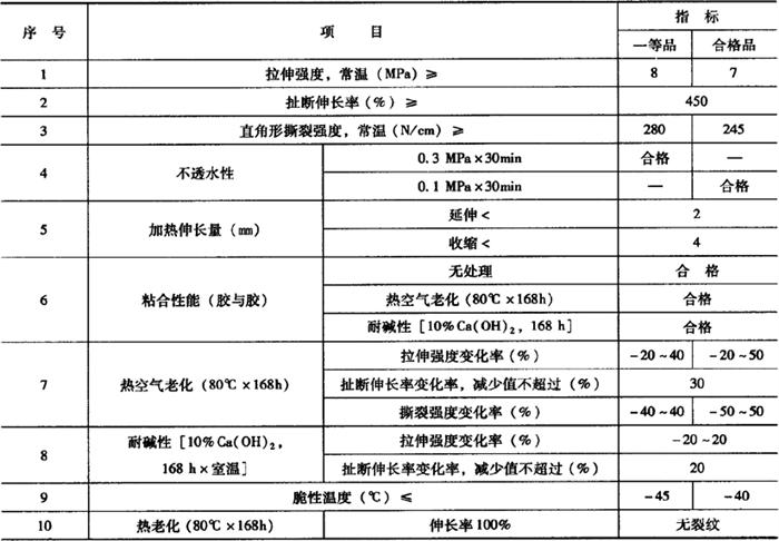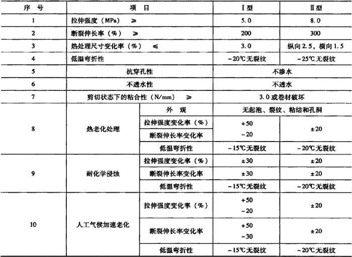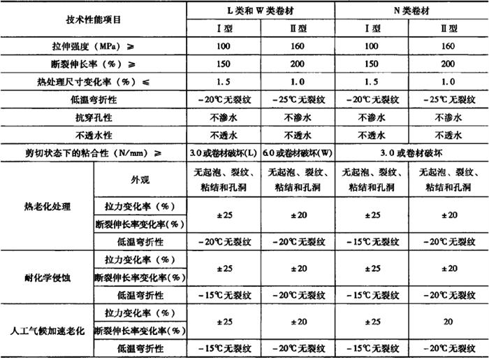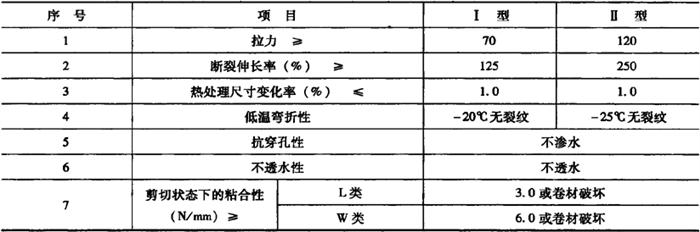释义 | 合成高分子防水卷材 以合成橡胶、合成树脂为基料,或者以二者的混合料为基料,加入适量的化学助剂和填充料,经过不同的工艺加工而制成的可卷曲片状防水材料,或将制成的片材与合成纤维等复合而成两层或两层以上的可卷曲的片状材料,称为合成高分子防水卷材。 合成高分子防水卷材又分为橡胶类(如三元乙丙橡胶防水卷材、丁基橡胶防水卷材、再生胶防水卷材等)、树脂类(如氯化乙烯防水卷材、聚氯乙烯防水卷材、聚乙烯防水卷材、氯磺化聚乙烯防水卷材等)和橡塑共混类(如氯化聚乙烯-橡胶共混防水卷材、三元乙丙橡胶-聚乙烯共混防水卷材等)三大类。 合成高分子防水卷材,具有重量较轻、延伸率大、抗拉强度高、抗裂强度高、低温柔性大、耐热性好、耐腐蚀、耐老化性能均佳,防水性能优良,可冷施工等特点,属于高档防水卷材。这类防水卷材料的厚度有1.0mm,1.2mm,1.5mm,2.0mm四种,其宽度不得小于1000mm,每卷长度一般为20m。 合成高分子防水卷材的外观质量要求,主要从折痕(每卷不超过2处、总长度不超过20mm)、杂质(不允许有大于0.5mm的颗粒)、胶块(每卷不超过5处、每处面积不超过4mm2)、缺胶(每卷不超过6处、每处不大于7mm2)四个方面进行评价。合成高分子防水卷材的外观质量、规格和物理性能应符合表10-20、表10-21和表10-22中的要求。 表10-20 合成高分子防水卷材的外观质量要求 表10-21 合成高分子防水卷材的规格 表10-22 合成高分子防水卷材主要物理性能 注:本表摘自《地下防水工程施工质量验收规范》(GB50208-2002)。 (一)塑性树脂基防水卷材 1.氯化聚乙烯防水卷材 氯化聚乙烯防水卷材,是以氯化聚乙烯树脂和橡胶为主,加入适量的硫化剂、促进剂、稳定剂、软化剂等,经素炼、混炼、过滤、压延成型等工序加工制成的高弹性的防水卷材。这种防水卷材,兼具有塑料和橡胶的特性。 氯化聚乙烯防水卷材,根据中华人民共和国国家标准《氯化聚乙烯防水卷材》(GB 12953-2003)中的规定,产品按有无复合层分类,无复合层的为N类、用纤维单面复合的为L类、织物内增强的为W类,它们的物理化学性能分别见表10-23和表10-24。 表10-23 N类氯化聚氯乙烯防水卷材的外观质量标准(摘自GB12953-2003) 注:非外露使用可以不考核人工气候加速老化性能。 表10-24 L类和W类氯化聚氯乙烯防水卷材的外观质量标准(摘自GB12953-2003) 注:非外露使用可以不考核人工气候加速老化性能。 这类防水卷材,根据氯化聚乙烯和橡胶的比例不同,还有若干不同的品种,如LYX-603氯化聚乙烯橡胶防水卷材、CNR-922防水卷材等。 (1)LYX-603氯化聚乙烯橡胶防水卷材 1)LYX-603防水卷材的特点。LYX-603防水卷材,系以氯化聚乙烯合成橡胶为基料,以玻璃纤维网布为增强骨胎加工制成的防水材料。由于这种防水材料具有优良的耐老化、耐臭氧、耐油性,所以该防水卷材不仅机械强度高、防水性能好,有良好的耐候性、耐臭氧性和耐热老化性,而且也有良好的耐酸碱和防霉等特性,还具有重量轻、使用寿命长,能在-50~+80℃的温度下使用,对环境无污染等特点。 2)LYX-603防水卷材的适用场合。LYX-603防水卷材可适用于各种工业与民用建筑物屋面的防水层;地下工程(包括地下铁道、地下室、地下车库等)的防水层;卫生间、浴室和蓄水池等的防水层等。主要技术性能指标见表10-25。 表10-25 LYX-603防水卷材及配套胶粘剂的主要技术性能 注:1.表列数据系江苏常熟市三恒建材有限责任公司(常熟市防水材料厂)产品水貂牌LYX-603氯化聚乙烯橡胶防水卷材的性能指标。 2.LYX-603(Ⅱ)为Ⅱ型、增强型氯化聚乙烯橡胶防水卷材;S-628(Ⅰ)为Ⅰ型、非增强型氯化聚乙烯橡胶防水卷材。 (2)CNR-922防水卷材 1)CNR-922防水卷材的特点。CNR-922防水卷材,系氯化聚乙烯橡胶防水卷材中的一种。其是以含氯量35%~40%的氯化聚乙烯树脂和橡胶为主体,加入适量的硫化剂、促进剂、稳定剂、软化剂和填充剂等,经过塑炼、过滤、压延成型、硫化检验等工序加工制成的一种高弹性防水卷材。这种卷材具有强度高、延伸性好、耐老化、阻燃、耐候等优良性能,施工可采用冷作业,工序简单,施工方便,可减少环境污染。 2)CNR-922防水卷材的适用场合。CNR-922防水卷材,既适用于屋面工程、楼地面、厨房、厕所等建筑的防水,也适用于其他土木工程及市政工程的防水。 CNR-922防水卷材的技术性能指标见表10-26。 表10-26 CNR-922防水卷材的技术性能指标 2.聚乙烯防水卷材 聚乙烯防水卷材又称为丙纶无纺布双覆面聚乙烯防水卷材,它是由聚乙烯树脂、填料、增塑剂、抗氧化剂等经混炼、压延,并双面覆丙纶无纺布而成。 聚乙烯防水卷材的抗拉强度高、不透水性好、耐老化、断裂伸长率高(40%~150%)、低温柔性好、与基层的粘结力强,其使用寿命在15年以上,属于中高档防水卷材,可用于屋面、地下等防水工程,特别适合于寒冷地区的防水工程。 3.聚氯乙烯防水卷材 聚氯乙烯防水卷材是由聚氯乙烯、软化剂或增塑剂、填料、抗氧化剂和紫外线吸收剂等,经过混炼、压延等工序加工而成的弹塑性卷材。软化剂的掺入增大了聚氯乙烯分子间距,提高了变形的能力,同时也起到了稀释作用,有利于卷材的生产。常用的软化剂为煤焦油。适量的增塑剂能够降低聚氯乙烯分子间力,使分子链的柔顺性提高。由于软化剂和增塑剂的掺入,使聚氯乙烯防水卷材的变形能力和低温柔性大大提高
