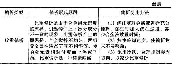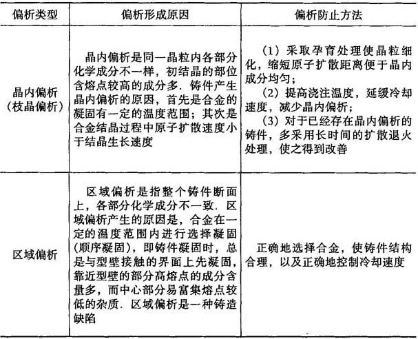 铸件凝固以后,铸件断面各部分以及晶粒内,往往有化学成分不均匀的现象,这种现象就是偏析.偏析的类型及偏析的防止方法如表4-8所示.