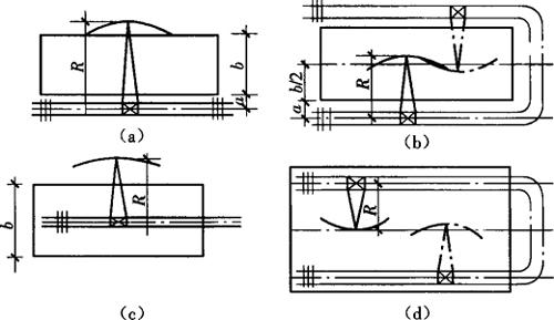 (a)单侧布置;(b)双侧(或环形)布置;(c)跨内单行布置;(d)跨内环形布置
