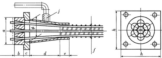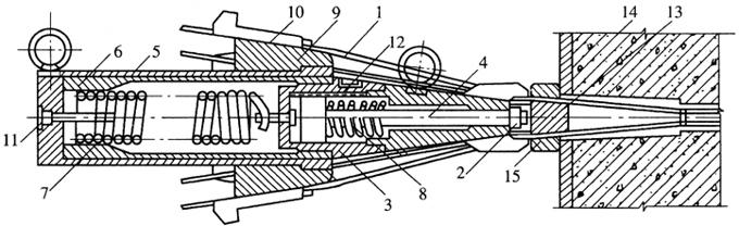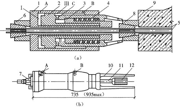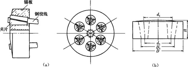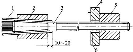 释义 | 后张法张拉设备的组成 后张法的张拉设备主要包括:锚具、张拉千斤顶。 (一)锚具 锚具是后张法结构或构件中为保持预应力筋拉力,并将其传递到混凝土上用的永久锚固装置。在后张法中,锚具是建立预应力值和保证结构安全的关键,是预应力构件的一个组成部分。要求锚具的尺寸形状准确,有足够的强度和刚度,受力后变形小,锚固可靠,不会产生预应力筋的滑移和断裂现象,并且应构造简单、加工方便、体积较小、成本较低,全部零件可换性好、使用方便。后张法所使用的锚具种类很多,各种都具有一定的适用范围,按其使用的锚具常分为:锚固单根钢筋的锚具、锚固成束钢筋的锚具和锚固钢丝束的锚具等。 1.单根钢筋锚具 单根粗钢筋的预应力筋,如果采用一端张拉,则在张拉端采用螺丝端杆锚具,固定端采用帮条锚具或镦头锚具;如果采用两端张拉,则两端均应采用螺丝端杆锚具。 (1)螺丝端杆锚具 螺丝端杆锚具由螺丝端杆、螺母及垫板组成,如图6-16所示,这是单根预应力粗钢筋张拉端常用的锚具。其适用于直径不大于36mm的冷拉钢筋的锚固。此锚具也可作为先张法夹具使用,电热张拉时也可以采用。 图6-16 螺丝端杆锚具 1-螺丝端杆;2-螺母;3-垫板;4-焊接接头;5-钢筋 螺丝端杆锚具是将螺丝端杆与预应力筋对焊成一个整体,用张拉设备张拉螺丝杆,用螺母锚固预应力筋,具有施工简便、锚固可靠等优点。螺丝端杆锚具的强度,不得低于预应力筋的抗拉强度实测值。 螺丝端杆可采用与预应力筋同级别冷拉钢筋制作,也可采用冷拉或热处理45号钢制作。螺杆的长度一般为320mm,当构件长度超过30m时,一般为370mm;其净截面积应大于或等于所对焊的预应力筋截面面积;螺丝端杆与预应力筋的焊接,应在预应力筋冷拉以前进行,以便检验焊接质量;冷拉时螺母的位置应在螺丝端杆的端部,经冷拉后螺丝端杆不得发生塑性变形。 (2)帮条锚具 帮条锚具由衬板和三根帮条焊接而成,如图6-17所示,是单根预应力粗钢筋非张拉端的锚具。衬板宜采用30号钢,帮条宜采用与预应力筋同级别的钢筋。帮条安装时,三根帮条应互成120°角,其与衬板相接触的截面应在一个垂直平面上,以免受力时产生扭曲。帮条的焊接可在预应力筋冷拉前或冷拉后进行,施焊方向应由里向外,引弧及熄弧均应在帮条上,严禁将地线搭在预应力筋上引弧,并严禁将地线搭在预应力筋上。 图6-17 帮条锚具示意图 1-帮条;2-衬板;3-预应力筋 常用的帮条规格尺寸见表6-7。 表6-7 帮条与焊缝的尺寸mm (3)精轧螺纹钢筋锚具 精轧螺纹钢筋锚具由垫板和螺母组成,是一种利用与该螺纹匹配制螺母锚固的支承式锚具。主要适用于锚固直径25~32mm的高强度精轧螺纹钢筋。 螺母分为平面螺母和锥面螺母两种。锥面螺母可通过锥体与锥孔的配合,保证预应力筋的正确对中;开缝的作用是增强螺母对预应力筋的夹持能力。垫板也相应地分为平面垫板和锥面垫板两种,其形式如图6-18所示。 图6-18 精轧螺纹钢筋锚具垫板形式 (a)锥面螺母与垫板;(b)平面螺母与垫板 (4)单孔夹片锚具 单孔夹片锚具是由锚环与夹片组成。夹片的种类很多,按片数不同可分为三片式与二片式;按开缝形式不同可分为直开缝与斜开缝。单孔夹片锚具如图6-19所示。 图6-19 单孔夹片锚具 (a)组装图;(b)锚环;(c)三片式夹片;(d)二片式夹片;(e)斜开缝夹片 1-钢绞线;2-锚环;3-夹片 2.预应力筋束、钢绞线锚具 预应力筋束锚具,又称为多孔夹片锚固体系(群锚),是在一块多孔的锚板上,利用每个锥形孔装一副夹片夹持一根钢筋或钢绞线的一种楔紧式锚具。这种锚具在现代预应力混凝土工程中广泛应用,其主要产品有:XM型锚具、QM型锚具、QVM型锚具和BS型锚具等。 (1)XM型锚具 XM型锚具由锚板和夹片组成。锚板的尺寸由锚孔数确定,锚孔沿锚板圆周排列,中心线倾角为1∶20;与锚板顶面垂直;夹片为120°均分斜开缝三片式,开缝沿轴向的偏转角与钢绞线的扭角相反。 XM型锚具适用于锚固3~37根Φ15钢绞线束或3~12根7Φ5钢丝束,如图6-20所示。其特点是每根钢绞线都是分开锚固的,任何一根钢绞线的锚固失效(如钢绞线拉断、夹片破裂等),不会引起整束锚固的失效。 图6-20 XM型锚具 (a)装配图;(b)锚板 XM型锚具可作工具锚与工作锚使用。当用于工具锚时,可在夹片与锚板之间涂抹一层固体润滑剂(如石蜡、石墨等),以利于夹片的松脱。当用于工作锚时,具有连续反复张拉的功能,可用于行程不大的千斤顶张拉任意长度的钢绞线。 (2)QM型锚具 QM型锚具与XM型锚具一样,也是由锚板与夹片组成,如图6-21所示。它与XM型锚具不同之处是:锚孔是直的,锚板顶面是平的,夹片垂直开缝,备有配套喇叭形铸铁垫板与弹簧圈等。由于灌浆孔设在垫板上,锚板的尺寸可稍小一些。 QM型锚具适用于锚固4~31根Φ12.7钢绞线和3~10根Φ15钢绞线。QM型锚具配有自动工具锚,张拉和退出十分方便,并可减少和安装工具锚所花费的时间。 图6-21 QM型锚具及配件 1-锚板;2-夹片;3-钢绞线;4-喇叭形铸铁垫板;5-弹簧圈;6-预留孔道用的螺旋管;7-灌浆孔 (3)QVM型锚具 QVM型锚具是在QM型锚具的基础上,加以改进发展起来的一种新型锚具,其与QM型锚具的不同之处是:夹片改用二片式直开缝,操作更加方便,如图6-22所示。 图6-22 QVM型锚具及配件 (4)BS型锚具 BS型锚具锚下采用钢垫板、焊接喇叭管与螺旋筋,灌浆孔设置在喇叭管上,并由塑料管引出。适用于锚固3~55Φ