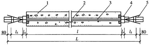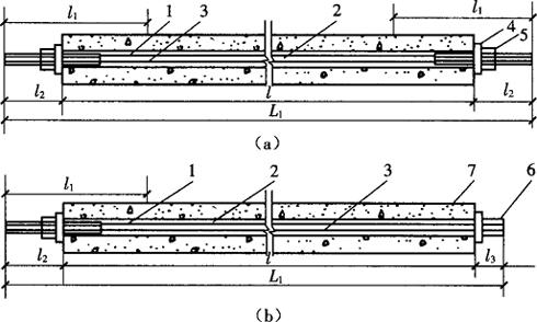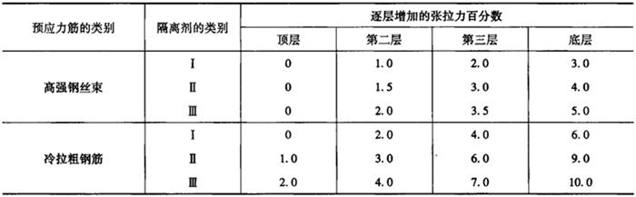释义 | 后张法施工工艺 后张法的施工工艺主要包括:预留孔道、预应力筋制作、预应力筋的穿入敷设、预应力筋的张拉与锚固和孔道灌浆。 (一)预留孔道 预留孔道主要为穿预应力筋(束)及张拉锚固后灌浆用。预留孔道的正确与否,是后张法构件生产中的关键之一,预留孔道方法有钢管抽芯法、胶管抽芯法、预埋管法等,其基本要求是:孔道的尺寸与位置应正确,孔道应平顺,接头不漏浆,端部的预埋钢板应垂直于孔道中心线,孔道的直径应符合要求。 1.钢管抽芯法 钢管抽芯法用于直线孔道。预先将钢管埋设在模板内的孔道位置,在混凝土浇筑和达到终凝之前,应间隔一定时间缓慢转动钢管,不使混凝土与钢管粘结,待混凝土初凝后、终凝前将钢管抽出。为了保证预留孔道的质量,施工时应注意以下几点: (1)要求钢管平直、表面光滑,预埋前应除锈、刷油,安放位置准确;钢管在构件中用钢筋井字架定位,井字架间距不宜大于1.0m。钢管每根长度最好不超过15m,两端各应伸出构件100mm左右。钢管一端钻16mm小孔,以便于旋转和抽管。 (2)掌握好抽管时间。抽管过早,混凝土未达到一定强度,会造成坍孔事故;抽管过晚,混凝土与钢管易粘结,造成抽管困难。具体抽管时间与水泥品种、施工气温和养护条件有关。一般掌握在混凝土初凝后、终凝前,手指按压混凝土表面不显指纹即可抽管,常温下抽管时间约在混凝土浇筑后3~6h。抽管前每隔10~15min转动一次钢管。 (3)抽管顺序宜先上后下进行。抽管方法可用人工或卷扬机,抽管时必须速度均匀,边抽边转,并与孔道保持在一条直线上,防止构件表面发生裂缝。抽管后应及时检查孔道情况,并做好穿筋前的孔道清理工作,避免日后穿筋困难。 (4)采用钢筋束镦头锚具和锥形螺杆锚具留设孔道时,张拉端的扩大孔也可用钢管成型,留孔时应注意端部扩孔应与中间孔道同心。抽管时先抽中间钢管,后抽扩孔钢管,以免碰坏扩孔部分,并保持孔道平滑和尺寸准确。 (5)由于孔道灌浆需要,在浇筑混凝土时,应在设计规定位置留设灌浆孔。一般情况下在构件两端和中间,每隔12m设置一个直径为20~25mm的灌浆孔,并在构件两端各设一个排气孔。 2.胶管抽芯法 预留孔道所用的胶管,采用5~7层帆布夹层、壁厚6~7mm的普通橡皮管,可用于直线、曲线或折线孔道。胶皮安放于设计位置后,也用钢筋井字架固定,直线孔道井字架间距不宜大于0.5m,曲线孔道适当加密;在浇筑混凝土前,在胶管中以0.6~0.8N/mm2的压力充水或充气,使胶管直径增大3mm左右然后浇筑混凝土;混凝土脱离,随即抽出胶管形成孔道。 在混凝土浇筑成型时,振动机械不能直接碰撞胶管,并经常注意压力表上的压力是否正常,如灌浆压力发生变化,必要时可以补压。待混凝土达到初凝后、终凝前,将胶管阀门打开放水(或放气)降压,胶管回缩与混凝土自行脱落。 胶管抽芯与钢管抽芯相比,具有弹性好,便于弯曲,不需转动等优点。因此,它不仅可以留设直线孔道,而且可以留设曲线孔道。使用胶管留设孔道,胶管必须具有良好的密封装置,抽管时间应比钢管略迟。抽管后,应及时清理孔道内的堵塞物。 3.预埋管法 预埋管法是采用黑铁皮管、薄钢管、镀锌钢管与金属螺旋管(波纹管)等。其中金属螺旋管是由镀锌薄钢带经压波后卷成,具有重量轻、刚度好、弯折方便、连接容易、与混凝土粘结良好等优点,可做成各种形状的孔道,并可省去抽管工序,是目前预埋管法的首选管材。 金属螺旋管使用前应做灌水试验,检查有无渗漏现象;管头连接应采用大一号同型管,接头管长度为200mm;管的固定采用钢筋卡子并用铁丝绑牢,钢筋卡子焊在箍筋上,卡子间距不大于600mm;管子尽量避免反复弯曲,以防止管壁开裂。 (二)预应力筋制作 预应力筋的制作,主要根据所选用的预应力钢材的品种、锚(夹)具类型及生产工艺等方面确定。预应力制作包括下料长度的计算和编束。 预应力筋的下料长度应由计算确定,计算时应考虑结构的孔道长度、锚(夹)具厚度、千斤顶长度、焊接接头或镦头预留量、冷拉伸长率、弹性回缩值、张拉伸长值等。 1.预应力筋的下料长度 (1)单根预应力粗钢筋的下料长度 1)当预应力筋两端采用螺纹端杆锚具时(图6-30),其成品全长(包括螺纹端杆在内冷拉后的全长)可按下式计算: 图6-30 粗钢筋的下料长度计算示意图 (a)两端用螺纹端杆锚具;(b)一端用螺纹端杆锚具 1-螺纹端杆;2-预应力筋;3-对焊接头;4-垫板;5-螺母;6-帮条锚具;7-混凝土构件 预应力筋(不包括螺丝端杆)冷拉后需达到的长度,可按下式计算 预应力筋(不包括螺丝端杆)冷拉前的下料长度,可按下式计算 式中 l——构件的孔道长度(mm); l2——螺丝端杆伸出构件外的长度(mm),张拉端l2=2H+h+5mm;10mm; H——螺母的高度(mm); l1——螺丝端杆的长度(一般为320mm); γ——预应力筋的冷拉率(由试验确定); δ——预应力筋的冷拉弹性回缩率(一般为0.4%~0.6%); n——对焊接头的数量; △——每个对焊接头的压缩量(一般为20~30mm); H——垫板的厚度(mm)。 锚固端l2=H+h+ 2)当预应力筋一端用螺纹端杆,另一端用帮条(或镦头)锚具时,其成品全长L1(包括螺纹端杆在内冷拉后的全长)、预应力筋(不包括螺丝端杆)冷拉后需达到的长度L0和预应力筋(不包括螺丝端杆)冷拉前的下料长度L,可用下式计算: 为保证质量,冷拉钢筋宜采用控制应力的方法。如果在一批钢筋中冷拉率分散性较大时,应尽可能将冷拉率相
