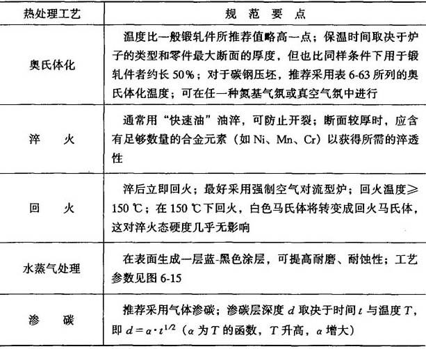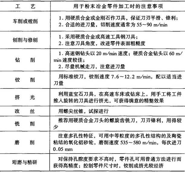 释义 | 后续加工 粉末冶金零件与制品的后续加工包括热处理、清理、涂覆、机械加工及连接,它们和一般的铸造或锻造零件大体上相同,但是,粉末冶金零件的某些特性,主要是其特有的孔隙度,往往对后续加工有强烈的影响. 6.3.4.1 热处理 粉末冶金零件的热处理工艺和相应的锻轧件或铸件的相似,注意两点,可得到的最高硬度取决于在奥氏体化温度下固溶体的含碳量;淬透性在很大程度上取决于密度与合金元素(如Ni、Mn、Cr或Mo)的含量,确定合金元素的精确含量很重要,因为这会影响热处理工艺,特别是奥氏体化与淬火. 烧结压坯和铸铁一样,都是非均质材料,粉末冶金零件中实际存在的孔隙是产生硬度测量误差的主要原因,随零件密度的增大,测定硬度的偏差值减校最佳方法是用测定显微硬度来确定热处理试样的实际硬度. 表6-62列出粉末冶金零件各种热处理工艺及规范. 表6-62 粉末冶金零件热处理工艺与规范要点 表6-73 碳钢压坯推荐采用的奥氏体化温度 图6-15 水蒸气处理工艺 6.3.4.2 连接 常采用机械方法(如螺栓、螺钉、铆钉或加桩)、焊接、铜焊及粘结剂,有时也用烧结法连接粉末冶金零件,表6-64列出几种常用的连接工艺及其特点. 表6-64 粉末冶金零件常用连接工艺 6.3.4.3 去毛刺 粉末冶金零件的边缘与表面通常产生毛刺,简单形状的零件,毛刺差不多可以自动脱落,但复杂形状的零件一般需要单独的去毛刺作业,表6-65列出几种去毛刺的最佳方法,它们有时也用于清理. 表6-65 去毛刺的最佳方法 6.3.4.4 清理 经常将滚光与喷射之类的方法看作是进行彻底清理之前的预处理作业,特别是零件要进行涂覆时,不推荐用酸洗,表6-66列出两种最好的清洗方法. 表6-66 粉末冶金零件的清理方法 6.3.4.5 涂覆涂覆前,均必须进行起始清理,水蒸气处理可作为最终表面处理的预涂覆作业,表6-67列出几种常用涂覆工艺. 表6-67 粉末冶金零件常用涂覆工艺 6.3.4.6 机械加工 粉末冶金零件的组织是机械加工产生问题的原因,可用涂抹金属表面将孔隙封闭,切削时切削液可能进入孔隙;磨削、抛光时,磨料可能会压入零件中,因此,当必须保存孔隙度时,要求将机械加工的工序减到最校并尽量使用最锋利的切削刀具,要确定所有切削刀具的表面粗糙度都很好,没有“锯齿”现象,同时要采用轻切削,即不得大于0.38mm,通常不使用切削液,在一些条件下,可使用轻矿物油,表6-68列出一些常见机加工工艺及在粉末冶金零件加工时的注意事项. 表6-68 常见机加工工艺及在粉末冶金零件加工时的注意事项 |