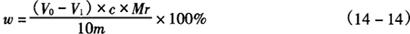 释义 | 含酯量的测定 1.定义和原理 在规定条件下用氢氧化钾乙醇溶液加热水解酯类,然后用标准酸溶液滴定过量的碱。 RCOOR′+KOH→RCOOK+R′OH 酯值是皂化1g试样中的酯所需氢氧化钾的毫克数。 本法适用于单离及合成香料中单一酯类含量的测定,不适用于混合酯类及难以皂化的酯类。 2.测定方法 2.1 仪器和试剂。 2.1.1 皂化瓶:耐碱玻璃,容量为150mL,具有冷凝器或长约1m,直径约10mm的空气冷凝管。 2.1.2 滴定管:50mL,刻度为0.1mL。 2.1.3 移液管:25mL。 2.1.4 分析天平。 2.1.5 沸水浴。 2.1.6 中性精制乙醇:95%(体积分数)。 2.1.7 0.5mol/LKOH乙醇溶液。 2.1.8 0.1mol/LNaOH溶液。 2.1.9 0.5mol/LHCl标准溶液。 2.1.10 酚酞指示液。 2.2 操作步骤 称取适量试样(精确至0.0002g)于150mL皂化瓶中,加入5mL95%(体积分数)乙醇中,加2滴酚酞指示剂。滴加氢氧化钠溶液以中和游离酸,用移液管准确加入25mL氢氧化钾乙醇溶液,连接空气冷凝管或冷凝器,在沸水浴上回流1h(或按产品标准规定)冷却至室温,取下空气冷凝器或冷凝管,加5~10滴酚酞指示剂,用盐酸标准溶液滴定至粉红色消失为止(如皂化后色泽较深,滴定前可加蒸馏水50mL),同时不加试样按上述操作步骤进行空白试验。 3.分析结果的表述 3.1,按式(14-14)计算含酯量质量分数(w)。 式中 V0——空白试验所耗酸标准溶液的体积,mL V1——滴定试样所耗酸标准溶液的体积;mL c——酸标准溶液的浓度,mol/L Mr——酸的相对分子质量 m——试样的质量,g 平行试验结果的允许差为0.5%。 3.2 按式(14-15)计算酯值(Ev)。 式中 V0,V1,c,m——同式(14-14) 56.1——氢氧化钾的相对分子质量 4.注意事项 4.1 取样多少,视样品含酯量高低而定,一般为0.5~5g,(V0-V1)至少等于10mL。 4.2 回流时间为1h,有些难以皂化的酯需要较长时间,这在产品标准中另有规定。某些难以皂化的酯类方法另有规定。 4.3 如试样为甲酸类酯类,则中和游离酸时,应将试样溶液的温度保持在0℃左右进行。 4.4 如试样酸值过高,应另取试样分别测定酸值和皂化值,酯值可以从皂化值减去酸值而得。 4.5 试样中如含有大量醛类时,测定酯时误差极大,酚类也干扰酯的测定。 4.6 本法也可测定内酯。 |