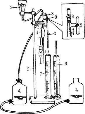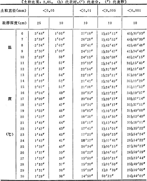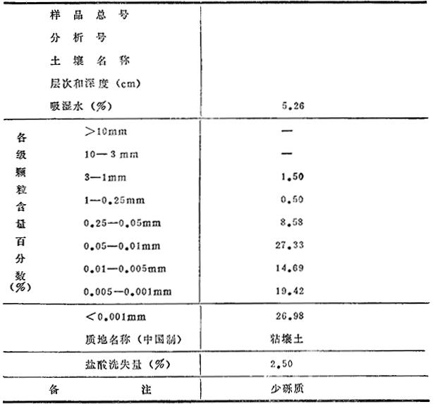 释义 | 吸管法 这个方法是比较标准而广泛被采用的一种土壤机械分析方法。 1.仪器设备 (1)吸管装置(图5-2):包括吸管(25ml)1,吸取土液用,管端有放射性进水口(沈阳玻璃仪器厂产品);如无此种特制吸管也可用普通吸管代替。盛水三角瓶(250ml)2,所贮的水作冲洗吸管之用。橡皮管3。抽气装置4,包括两个容量为1000ml以上的下口瓶(4a及4b),两瓶用橡皮管连接(图5-2),两瓶内所装总水量不超过一个瓶的总容积。抽气吸液前,先转动三向开关9接通1和3并关闭8,吹气入3,以排除吸管1头部中可能残留的水液,然后关闭9。在吸液时,把吸管沉入土液中,调节好吸管的深度,然后让4a留在桌面上,而让4b放在尽可能低的地方(如地板上),这时4a内的水由于重力关系就要流向低处4b内,这样就使4a内的空气减压。转动三向开关9至使4a和吸管1直接通路,这时土液就自动吸入管内,至25ml刻度时即可把开关9关闭(在实际操作时应尽可能吸至25ml刻度处,如有上落,则须把实际吸取的容积记下,以资计算)。经过若干次抽吸后,4a内的水都流入4b内;这时可转动三向开关9,使4a直接和3通路,把4b举高,水就自动流回(4a),关闭9又可进行抽吸如前。支架5。 (2)搅拌棒(图5-3),可以用不锈金属制成,也可以用长约50-55cm的粗玻棒,在其下端安装一带孔厚胶板(胶板直径略小于沉降量筒的直径,约5cm,孔的直径约3mm)。 (3)土粒沉降筒(图5-2的7),即1000ml量筒,直径约6cm,高约45cm。 图5-2 吸管装置 (4)恒温水槽:大小依放置量筒的数量而定。盛水高度应略低于量筒,水槽两壁为玻璃,以便观察。 (5)500ml三角瓶,瓶口有橡皮塞,塞上装有直立冷凝器,在煮沸土液时供回馏用。 (6)电炉。 (7)直径为6cm(或相近)的小铜筛,其筛孔直径分别为0.25,0.5,1,3mm。 (8)大漏斗(直径10cm)及小漏斗(直径为6-7cm)。 (9)天平(感量为1/10000)。 (10)高型称瓶(高5cm,直径为3cm)。 (11)砂浴或电热板。 (12)其他:秒表,温度计(60℃或100℃),烘箱(105℃),蒸发皿,干燥器,三角瓶,量筒(100ml)等。 图5-3 搅拌棒 2.试剂 (1)10%HCl溶液:取10ml浓盐酸(化学纯),加90ml蒸馏水混合而成。 (2)0.2N HCl溶液:取浓盐酸(化学纯)250ml,用蒸馏水稀释至15000ml,摇匀。 (3)0.05N HCl溶液:取浓盐酸(化学纯)62.5ml,用蒸馏水稀释至15000ml,摇匀。 (4)10%NH4OH溶液:取20ml1∶1氢氧化铵溶液,再加80ml蒸馏水混合均匀。 (5)10%HAc溶液:取10ml冰醋酸(化学纯),再加90ml蒸馏水混合均匀。 (6)4%(NH4)2C2O4饱和溶液:称取4g草酸铵(化学纯)溶于100ml蒸馏水中。 (7)10%HNO3溶液:取10ml浓硝酸(化学纯),再加90ml蒸馏水混合均匀。 (8)5%AgNO3溶液:称取5g硝酸银(化学纯)溶于100ml蒸馏水中。 (9)0.5N NaOH溶液:称取20g氢氧化钠(化学纯),加蒸馏水溶解后,定容至1000ml,摇匀。 (10)1N NaOH溶液:称取40g氢氧化钠(化学纯),加蒸馏水溶解后定容至1000ml,摇匀。 (11)0.5N Na2C2O4溶液:称取33.5g草酸钠(化学纯),加蒸馏水溶解后,定容至1000ml,摇匀。 (12)0.5N(NaPO3)6溶液:称取51g六偏磷酸钠(化学纯),加蒸馏水溶解后,定容至1000ml,摇匀。 3.测定步骤 (1)分离砾石:取风干土100-150g(含石砾多的,应取200-300g或更多些),放在研钵中,用带橡皮头的研杆研碎,并用孔径为1mm的筛子过筛,用粗天平将筛出的全部细土(小于1mm的)称重,并将留在筛上的直径大于1mm以上的石砾),烘干称重,计算其占烘干重的百分数。 (2)称取试样:取经过1mm筛孔的风干土样40-50g,分成3份,分别测定吸湿水、盐酸处理洗失量及制备机械分析用的悬液。土壤重量分配是:①测定吸湿水,粘土为4-5g,砂土为10g;②测定盐酸处理洗失量,粘土为10-15g,砂土为20-30g;③制备机械分析用的悬液,重粘土和重壤土为10-15g,砂壤土和砂土为20-30g。 (3)去除碳酸盐:取上述土壤10-20g二份,一份为测盐酸处理损失量,一份为机械分析样品的制备,分别放在蒸发皿中,滴入10%HCl,如无气泡发生,表示土壤无游离碳酸盐,可直接按下一步骤进行工作。如有气泡则须另加0.2N HCl,直至样品无CO2气泡出现为止(每次加入0.2N HCl1ml,并用带胶皮头的玻璃棒缓慢搅动)。 (4)除交换性钙镁等离子:土壤中碳酸盐经用0.2N HCl处理去除后,其胶体表面上仍可能含有交换性Ca2+、Mg2+等离子,其中以Ca2+为主,它们仍然影响土粒的分散,因此,必须用0.05NHCl继续淋洗土样,使其胶体全部被H+所饱和。为此,将上述曾用0.2N HCl处理过的两份土样用0.05N HCl分别冲至滤纸上过滤,其中一份是测定盐酸洗失量用的,过滤前须先将滤纸烘干称重;另一份制备悬液用,其滤纸无须事先称重。不断地用0.05NHCl淋洗土样,淋洗时要待第一次加入的0.05NHCl淋干后,再加入下次的HCl,这样可以加速淋洗速度,直洗至滤液中无Ca2+为止(取滤液2-3ml,加滴10%NH4OH至有NH3味后,再加10%HAc,使之呈微酸性,然后加饱和的(NH4)2C2O4,加热至沸,如无白色沉淀(CaC2O4),表示土样中已无交换性Ca2+)。再用蒸馏水洗净多余的HCl,淋洗至滤液中无Cl-为止(用试管取滤液少许,加入10%HNO31-3滴,使溶液酸化,然后加入5%AgNO31-2滴,如无AgCl白色沉淀,表示Cl-已洗尽)。 (5)定盐酸洗失量:将已称重的滤纸上的土样连同滤纸一同移入表玻璃或蒸发皿或称瓶中,在105℃烘箱内烘干至恒重,计算盐酸洗失量。 (6)分散土粒:将另一份滤纸上的土样全部洗至500ml三角瓶中(用洗瓶冲洗滤纸),使其总容量约为250ml。然后根据土壤的盐基交换量的不同,加入1N NaOH溶液(对交换量为每百克土10毫克当量的土壤,分散时应加入1ml1N NaOH溶液,其余可依此比例类推)。对不同的土样再加入不同的分散剂:石灰性土壤,每10g用0.5N偏磷酸钠10ml;中性土壤
