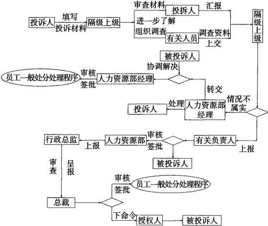 释义 | 员工投诉处理程序 说明: 1.投诉必须隔级投拆,投诉一般以协商解决为主,如属违法过失问题,必须呈报人力资源部来审核解决,一般处分由人力资源部核准后执行,二级法人公司由办公室核准,人力资源部上报行政总监审查后呈报总裁裁批执行,二级法人公司由总经理签批。 2.二级法人公司被投诉人是管理干部必须报集团公司人力资源审核。 |